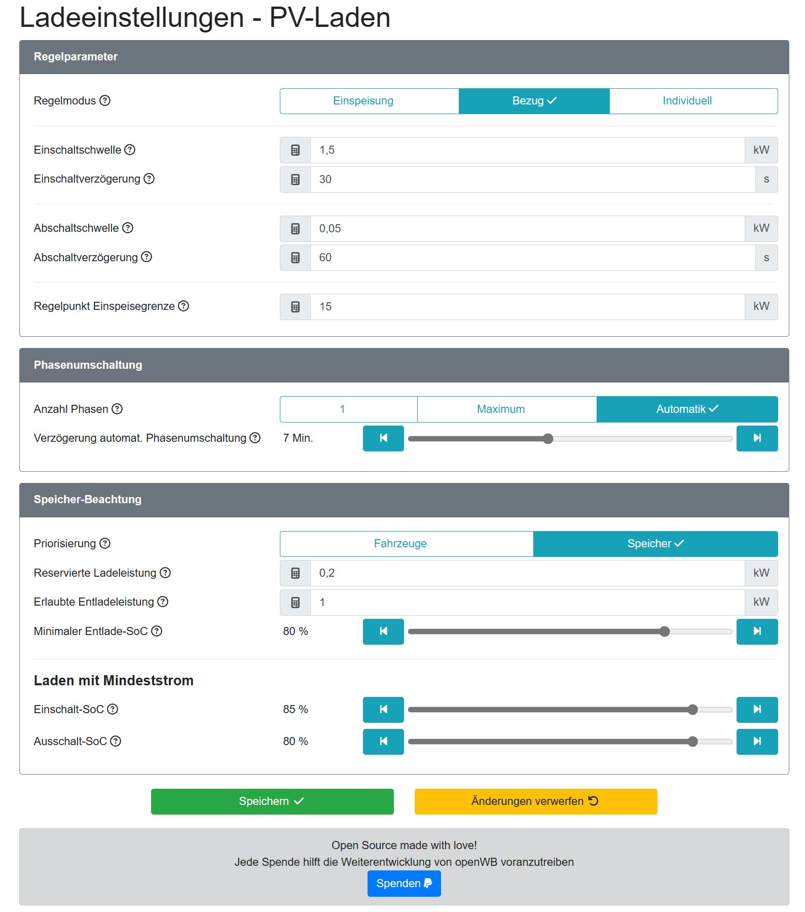 Es fehlen auch noch die Parameter von Ladeeinstellungen => PV-Laden (Regelmodus, Einschaltschwelle etc).