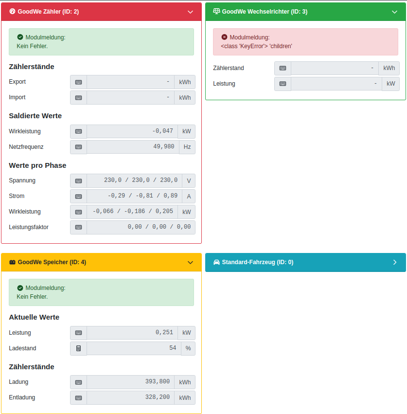 Ein paar Werte fehlen noch oder sind falsch, aber das ist wohl dem GoodWe-Modul für die "kleinen" WR geschuldet. Das Modul für die Großen in "feature_goodwe" funktioniert bei mir nicht, deshalb bin ich wieder im Release-Branch. Und hoffe sehr, dass openWB bald ein aktualisiertes Modul für die ET15-30 WR integriert...
