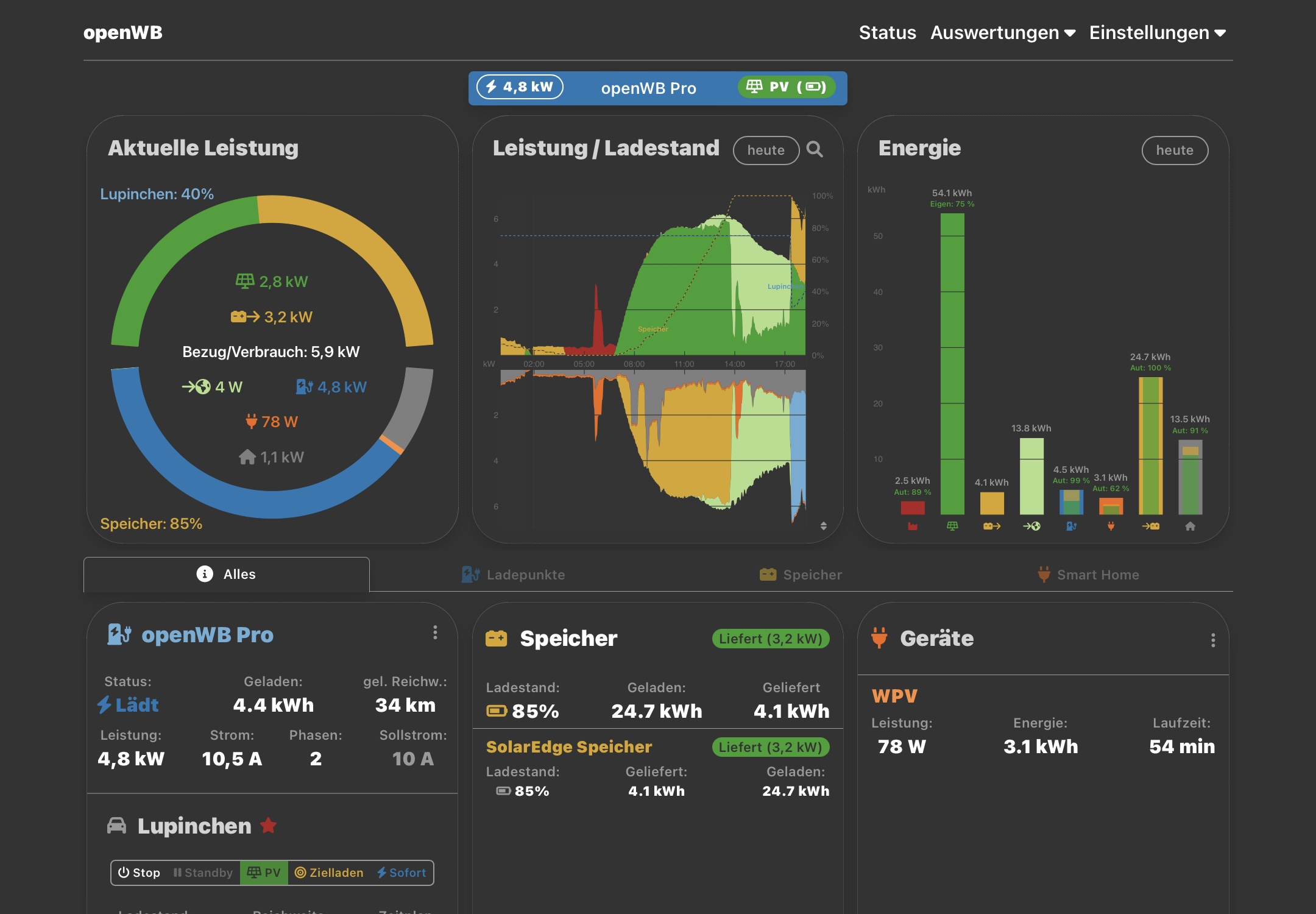 Das heißt z.B., dass bei Sonne Ladeströme >= 6 A über PV befriedigt werden. Schiebt sich eine Wolke vor die Sonne, werden die 6 A mittels Hausspeicher gehalten (unter Berücksichtigung der maximal entnehmbaren Leistung und der SoC-Grenzen).