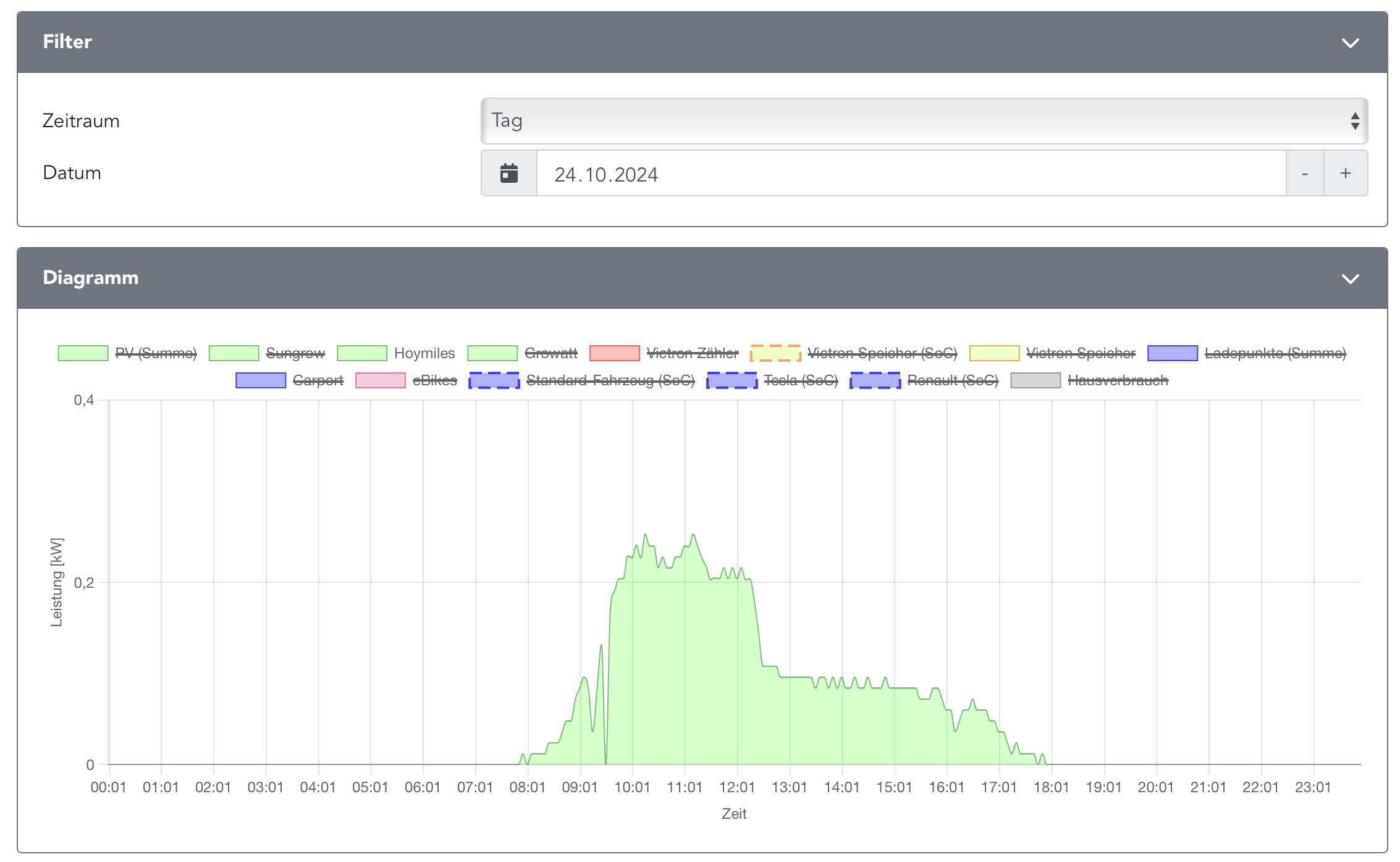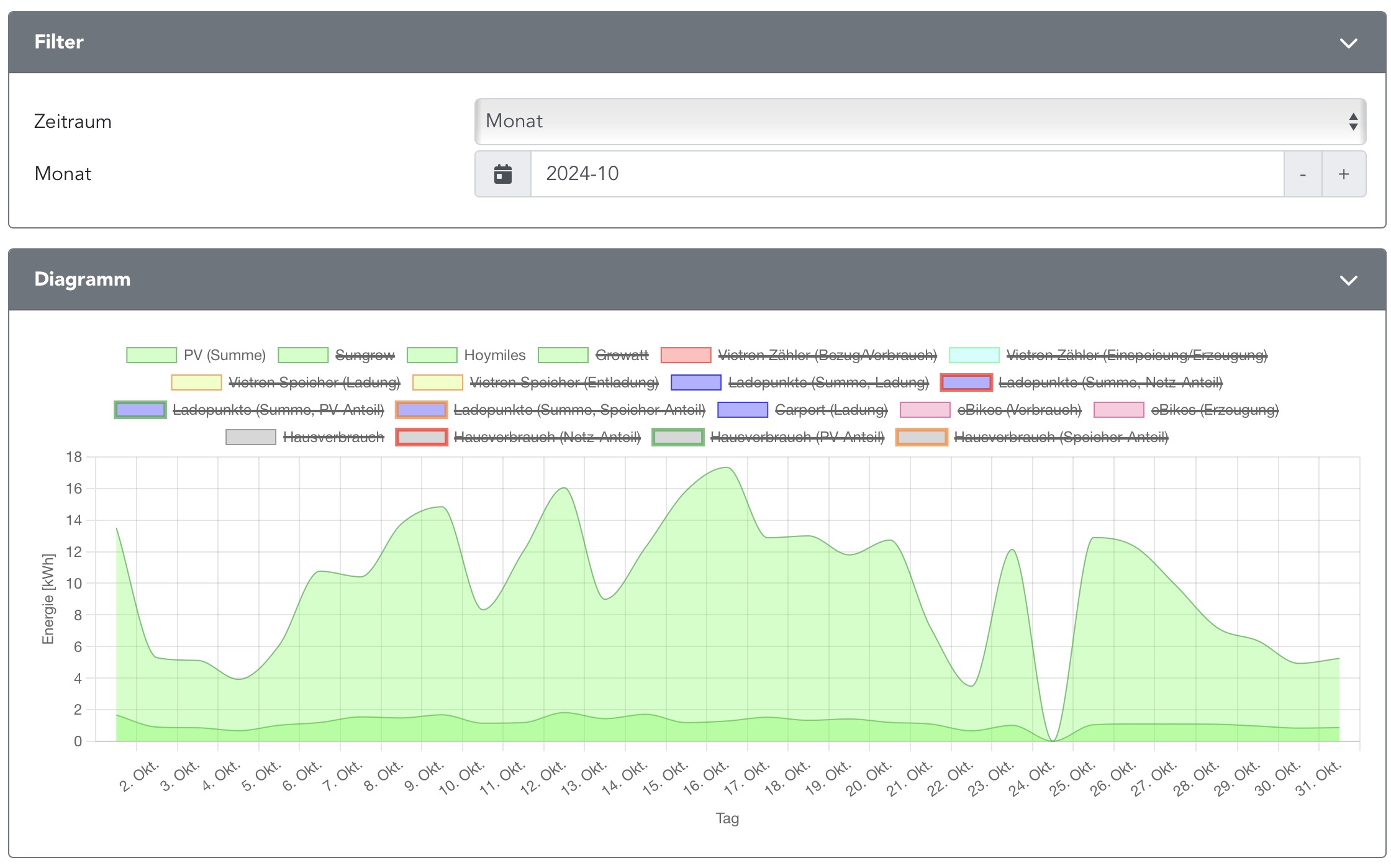 Ich habe noch etwas tiefer nachgeschaut und herausgefunden, dass für einen Wechselrichter (Hoymiles) für Monat Oktober am 24.10. keine Summe ausgewiesen wird im Diagramm. Dadurch ist aber auch die PV Summe aller Wechselrichter für diesen Tag auf 0 gegangen, obwohl bei den anderen Wechselrichter Leistungen im Diagramm angezeigt werden. Am 24.10. wird mir in der "Tagesansicht" jedoch sehr wohl ein Ertrag des hoymiles mit Tagessumme angezeigt.