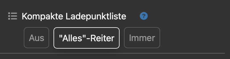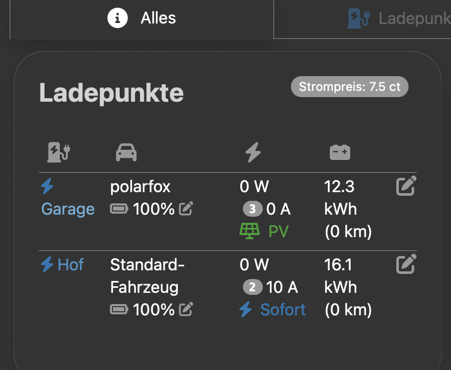 - Die kompakte Ladepunktliste kann jetzt wahlweise immer angezeigt werden oder nur im ersten Reiter. In zweiten Fall werden dann im Ladepunkt-Reiter die detaillierten Ladepunkte angezeigt - In der kompakten Ladepunktliste wird jetzt der aktuelle Strompreise angezeigt, falls ein Strompreis-Provider eingestellt ist Ein eigener Reiter für die Strompreistabelle kommt noch.