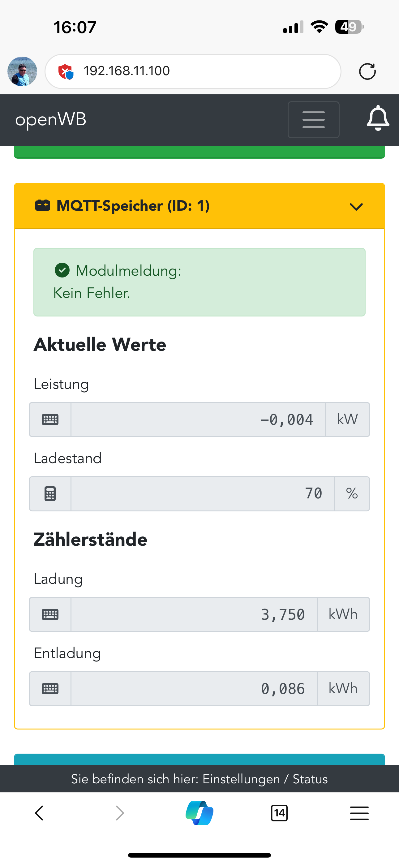 Und auf der Statusseite Dieses stimmt.