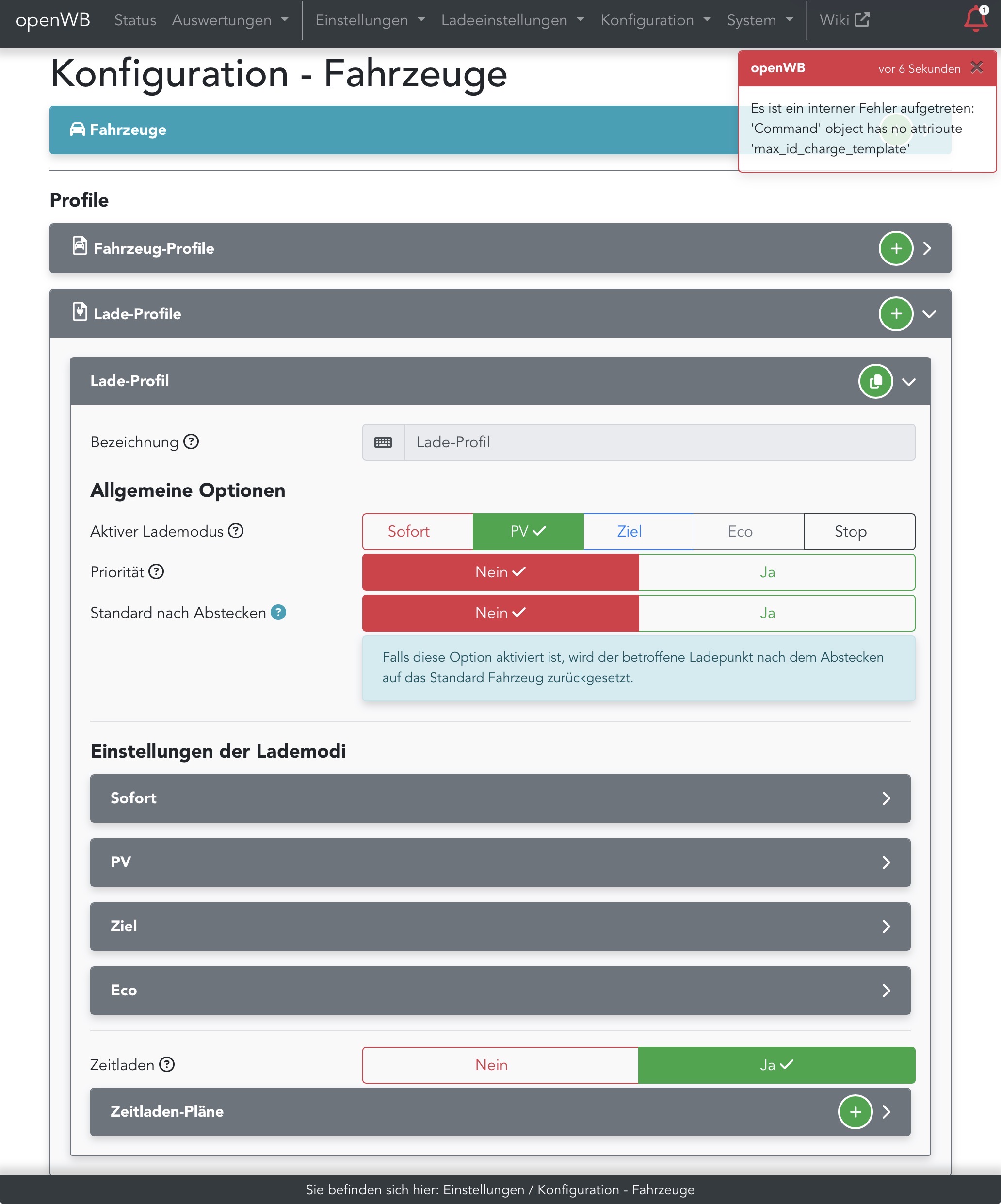 1. Webpage zur Einstellungen für Ladeprofile funktioniert nicht: