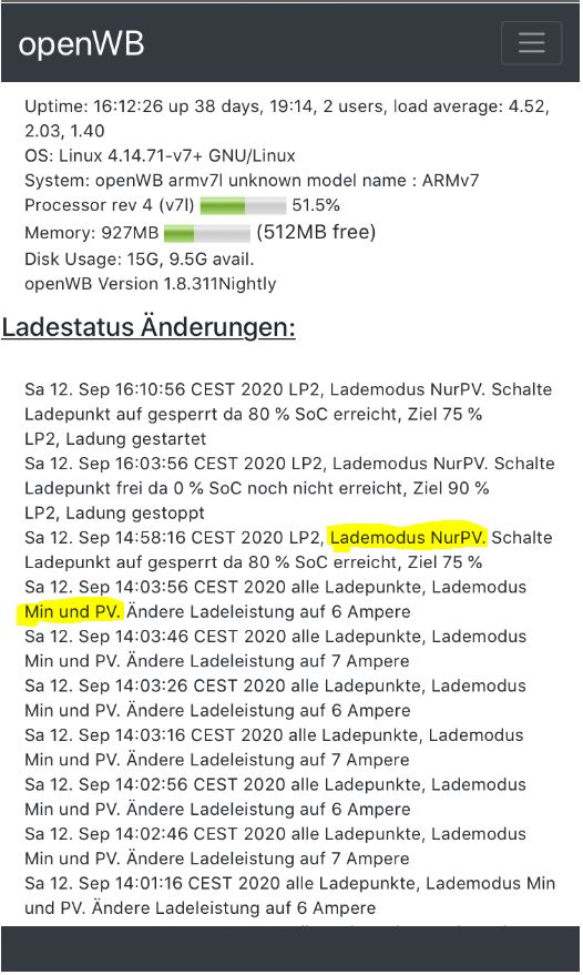 Da ich eine kleine PV-Anlage habe, benutze ich nur den Lademodus Min+PV. Bislang läuft alles super und ich hatte nie Probleme. Am Donnerstag berichtete meine Frau, dass die Ladung von der openWB gestoppt wurde, obwohl der eingestellte SoC noch nicht erreicht war. Im Ladelog unter Status stand nur "Ladung gestoppt", aber sonst nichts weiter. Laut meiner Frau war der LP auch nicht deaktiviert. Ich konnte den Fehler nicht nachvollziehen und habe den Ladepunkt mehrmals aktiviert/deaktiviert bzw. den SoC geändert. Irgendwann stand im Ladelog "Lademodus NurPV" obwohl nach wie vor Min+PV eingestellt war. Da ich diesen Thread kannte, dachte ich, bei mir hätte sich die openWB auch von alleine umgestellt. Das hätte dann auch die Abschaltung erklärt, da nicht genügend Leistung zur Verfügung stand. Ich habe dann nicht weiter nachgedacht und auf die Nightly 1.8.311 geupdated.