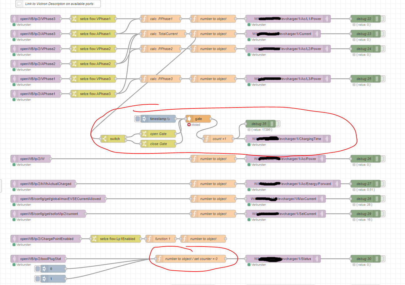 Daher habe ich mir das in NodeRed entsprechend erweitert. Bei jedem Connect wird eine Zählervariable auf 0 gesetzt. Diese wird dann - sofern geladen wird - im Sekundentakt hochgezählt und per MQTT an W/xxxxxxx/evcharger/1/ChargingTime übermittelt