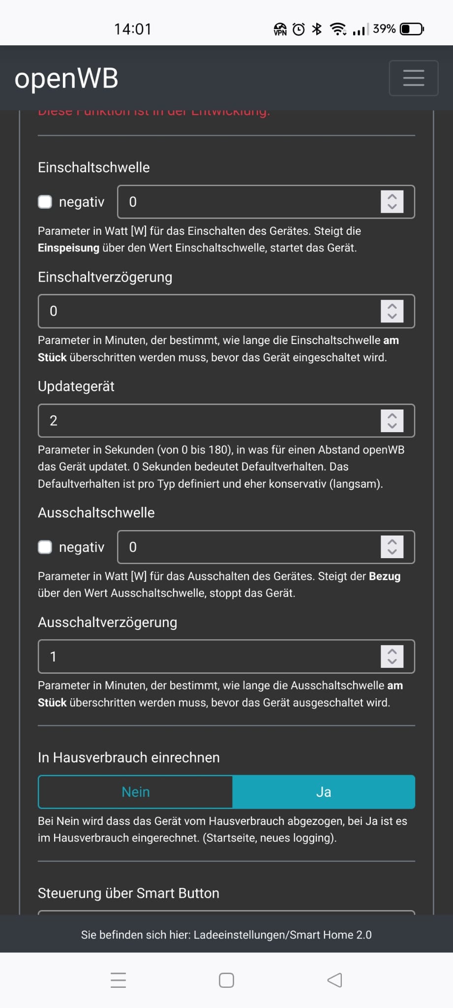 2023-11-08 13:50:45,554 INFO (2) Puffer rel: 1 oncnt/onstandby/time: 1/0/21240 Status/Üeb: 10/1 akt: 3455 Z1: 46096 Z2: 46096 2023-11-08 13:50:45,555 INFO Total Watt abschaltbarer smarthomedevices: 0 2023-11-08 13:50:45,555 INFO Total Watt nichtabschaltbarer smarthomedevices: 3455 2023-11-08 13:50:45,555 INFO Total Watt nicht im Hausverbrauch: 0 2023-11-08 13:50:45,556 INFO Anzahl devices in Auschaltgruppe: 0 akt: 0 Anzahl devices in Einschaltgruppe: 0 2023-11-08 13:50:45,556 INFO Einschaltgruppe rel: 0 Summe Einschaltschwelle: 0 max Einschaltverzögerung 0 nur Einschaltgruppe prüfen bis: 00:00:00 in Total sec 0 2023-11-08 13:50:45,558 INFO Mq pub openWB/SmartHome/Devices/2/RunningTimeToday=21240 old 21235 2023-11-08 13:50:45,560 INFO Mq pub openWB/SmartHome/Devices/2/Watt=3455 old 3717 2023-11-08 13:50:45,561 INFO Mq pub openWB/SmartHome/Devices/2/Wh=46096 old 46089 2023-11-08 13:50:45,562 INFO Mq pub openWB/SmartHome/Devices/2/WHImported_temp=165945600 old 165920400 2023-11-08 13:50:45,563 INFO Mq pub openWB/SmartHome/Status/wattnichtschalt=3455 old 3717 2023-11-08 13:50:45,564 INFO Mq pub openWB/SmartHome/Status/uberschuss=194 old 82 2023-11-08 13:50:45,566 INFO Mq pub openWB/SmartHome/Status/uberschussoffset=194 old 82 2023-11-08 13:50:45,568 INFO (2) Puffer Maximale Einschaltdauer nicht erreicht 2023-11-08 13:50:45,568 INFO (2) Puffer Überschuss 194 größer Einschaltschwelle oder Immer an zeit erreicht 0 2023-11-08 13:50:45,569 INFO (2) Puffer Einschaltverzögerung erreicht, bereits ein 2023-11-08 13:50:50,575 INFO EVU Bezug(-)/Einspeisung(+): 194 max Speicherladung: 0 2023-11-08 13:50:50,576 INFO Uberschuss: 194 Uberschuss mit Offset: 194 Pv: 4441 2023-11-08 13:50:50,576 INFO Speicher Entladung(-)/Ladung(+): 0 SpeicherSoC: 100 Ladung: False 2023-11-08 13:50:50,849 INFO (2) Gerät wurde upgedatet, neue Vorgabe 2811 Periode 5 2023-11-08 13:50:50,935 INFO (2) Puffer rel: 1 oncnt/onstandby/time: 1/0/21245 Status/Üeb: 10/1 akt: 3741 Z1: 46101 Z2: 46101 2023-11-08 13:50:50,935 INFO Total Watt abschaltbarer smarthomedevices: 0 2023-11-08 13:50:50,935 INFO Total Watt nichtabschaltbarer smarthomedevices: 3741 2023-11-08 13:50:50,935 INFO Total Watt nicht im Hausverbrauch: 0 2023-11-08 13:50:50,936 INFO Anzahl devices in Auschaltgruppe: 0 akt: 0 Anzahl devices in Einschaltgruppe: 0 2023-11-08 13:50:50,936 INFO Einschaltgruppe rel: 0 Summe Einschaltschwelle: 0 max Einschaltverzögerung 0 nur Einschaltgruppe prüfen bis: 00:00:00 in Total sec 0 2023-11-08 13:50:50,937 INFO Mq pub openWB/SmartHome/Devices/2/RunningTimeToday=21245 old 21240 2023-11-08 13:50:50,941 INFO Mq pub openWB/SmartHome/Devices/2/Watt=3741 old 3455 2023-11-08 13:50:50,941 INFO Mq pub openWB/SmartHome/Devices/2/Wh=46101 old 46096 2023-11-08 13:50:50,942 INFO Mq pub openWB/SmartHome/Devices/2/WHImported_temp=165963600 old 165945600 2023-11-08 13:50:50,942 INFO Mq pub openWB/SmartHome/Status/wattnichtschalt=3741 old 3455 2023-11-08 13:50:50,943 INFO (2) Puffer Maximale Einschaltdauer nicht erreicht 2023-11-08 13:50:50,943 INFO (2) Puffer Überschuss 194 größer Einschaltschwelle oder Immer an zeit erreicht 0 2023-11-08 13:50:50,943 INFO (2) Puffer Einschaltverzögerung erreicht, bereits ein 2023-11-08 13:50:55,949 INFO EVU Bezug(-)/Einspeisung(+): 813 max Speicherladung: 0 2023-11-08 13:50:55,949 INFO Uberschuss: 813 Uberschuss mit Offset: 813 Pv: 4430 2023-11-08 13:50:55,950 INFO Speicher Entladung(-)/Ladung(+): 0 SpeicherSoC: 100 Ladung: False 2023-11-08 13:50:56,204 INFO (2) Gerät wurde upgedatet, neue Vorgabe 3305 Periode 5 2023-11-08 13:50:56,289 INFO (2) Puffer rel: 1 oncnt/onstandby/time: 1/0/21251 Status/Üeb: 10/1 akt: 3788 Z1: 46105 Z2: 46105 2023-11-08 13:50:56,289 INFO Total Watt abschaltbarer smarthomedevices: 0 2023-11-08 13:50:56,289 INFO Total Watt nichtabschaltbarer smarthomedevices: 3788 2023-11-08 13:50:56,290 INFO Total Watt nicht im Hausverbrauch: 0 2023-11-08 13:50:56,290 INFO Anzahl devices in Auschaltgruppe: 0 akt: 0 Anzahl devices in Einschaltgruppe: 0 2023-11-08 13:50:56,290 INFO Einschaltgruppe rel: 0 Summe Einschaltschwelle: 0 max Einschaltverzögerung 0 nur Einschaltgruppe prüfen bis: 00:00:00 in Total sec 0 2023-11-08 13:50:56,292 INFO Mq pub openWB/SmartHome/Devices/2/RunningTimeToday=21251 old 21245 2023-11-08 13:50:56,293 INFO Mq pub openWB/SmartHome/Devices/2/Watt=3788 old 3741 2023-11-08 13:50:56,294 INFO Mq pub openWB/SmartHome/Devices/2/Wh=46105 old 46101 2023-11-08 13:50:56,295 INFO Mq pub openWB/SmartHome/Devices/2/WHImported_temp=165978000 old 165963600 2023-11-08 13:50:56,295 INFO Mq pub openWB/SmartHome/Status/wattnichtschalt=3788 old 3741 2023-11-08 13:50:56,296 INFO Mq pub openWB/SmartHome/Status/uberschuss=813 old 194 2023-11-08 13:50:56,296 INFO Mq pub openWB/SmartHome/Status/uberschussoffset=813 old 194 2023-11-08 13:50:56,298 INFO (2) Puffer Maximale Einschaltdauer nicht erreicht 2023-11-08 13:50:56,298 INFO (2) Puffer Überschuss 813 größer Einschaltschwelle oder Immer an zeit erreicht 0 2023-11-08 13:50:56,298 INFO (2) Puffer Einschaltverzögerung erreicht, bereits ein 2023-11-08 13:51:01,305 INFO EVU Bezug(-)/Einspeisung(+): 813 max Speicherladung: 0 2023-11-08 13:51:01,305 INFO Uberschuss: 813 Uberschuss mit Offset: 813 Pv: 4430 2023-11-08 13:51:01,306 INFO Speicher Entladung(-)/Ladung(+): 0 SpeicherSoC: 100 Ladung: False 2023-11-08 13:51:01,588 INFO (2) Gerät wurde upgedatet, neue Vorgabe 3331 Periode 5 2023-11-08 13:51:01,675 INFO (2) Puffer rel: 1 oncnt/onstandby/time: 1/0/21256 Status/Üeb: 10/1 akt: 4336 Z1: 46112 Z2: 46112 2023-11-08 13:51:01,676 INFO Total Watt abschaltbarer smarthomedevices: 0 2023-11-08 13:51:01,676 INFO Total Watt nichtabschaltbarer smarthomedevices: 4336 2023-11-08 13:51:01,676 INFO Total Watt nicht im Hausverbrauch: 0 2023-11-08 13:51:01,676 INFO Anzahl devices in Auschaltgruppe: 0 akt: 0 Anzahl devices in Einschaltgruppe: 0 2023-11-08 13:51:01,676 INFO Einschaltgruppe rel: 0 Summe Einschaltschwelle: 0 max Einschaltverzögerung 0 nur E