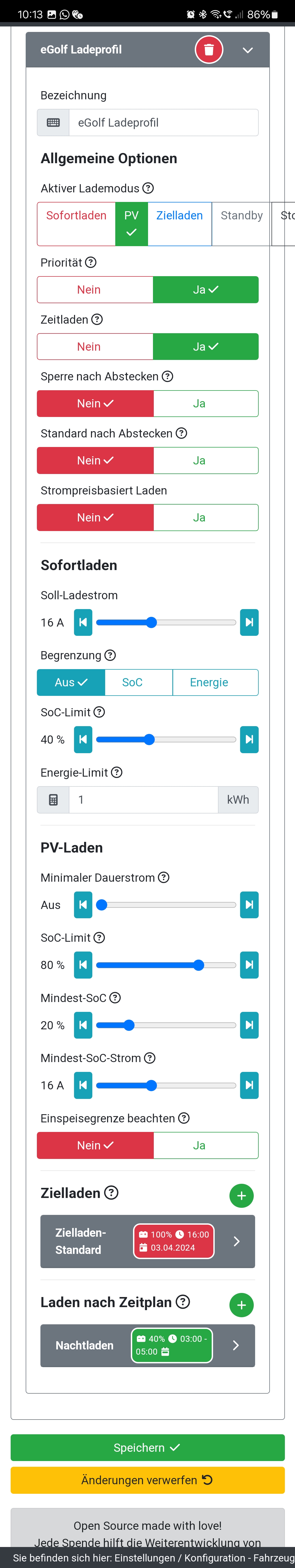 Mein Standard Ladeprofil: PV Laden mit entsprechenden Ziel-/Grenzwerten und Nachts Zeitladen (ehemals Nachtladen) zwischen 3 und 5 Uhr auf mind. 40%