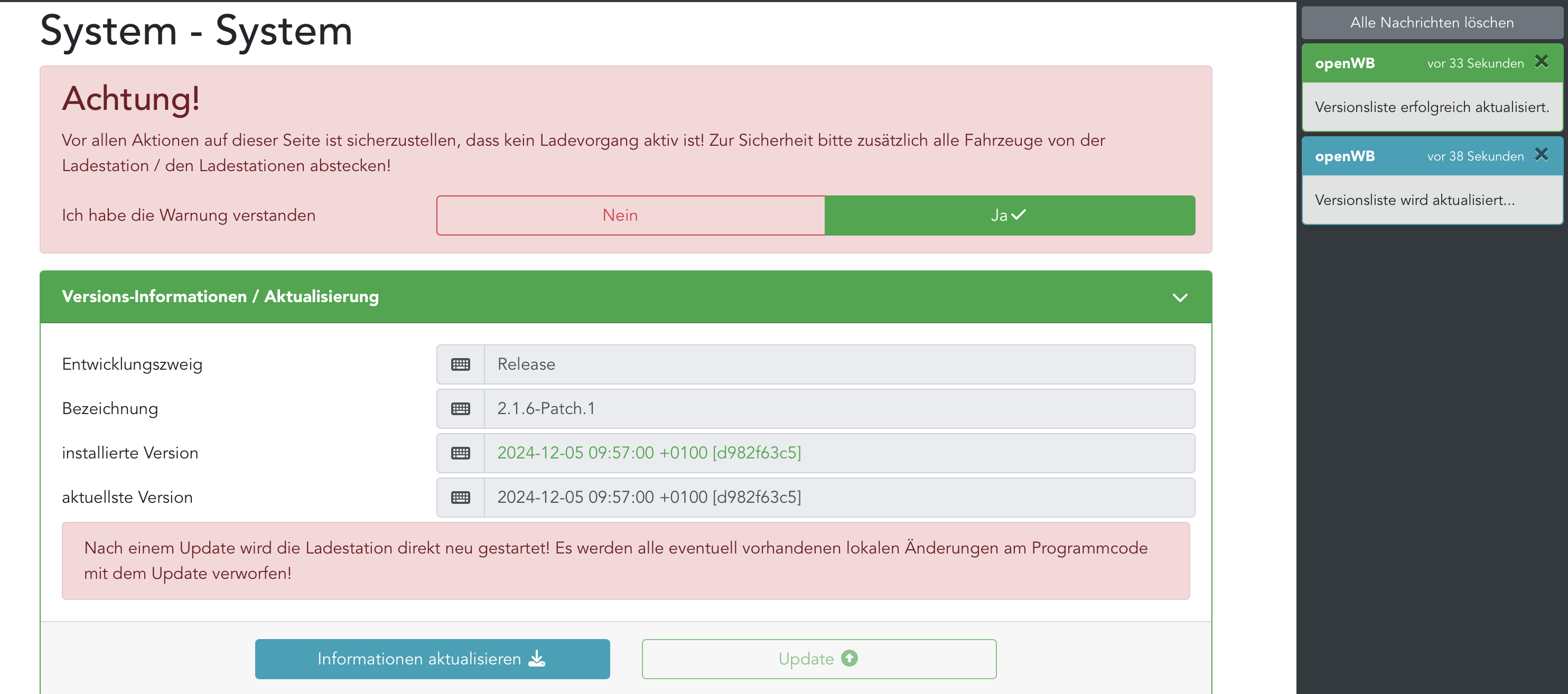 Alles schon gemacht. Auch Neustart. Es ist bei zwei verschiedenen OpenWB (series 2) so.Montair hat geschrieben: Sa Mär 15, 2025 5:03 am Die Versionsdaten aktualisiert hast du aber? Kommt auch eine Bestätigung, dass das erfolgreich war?