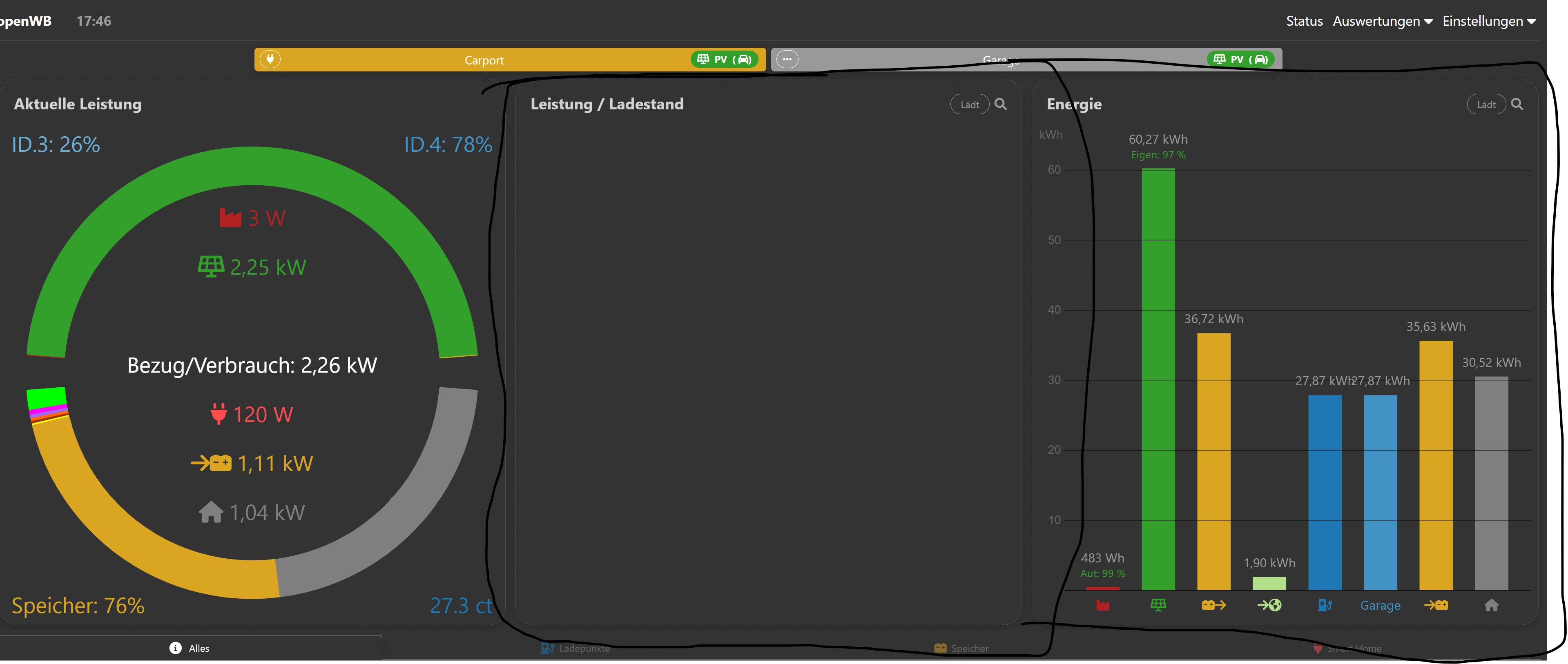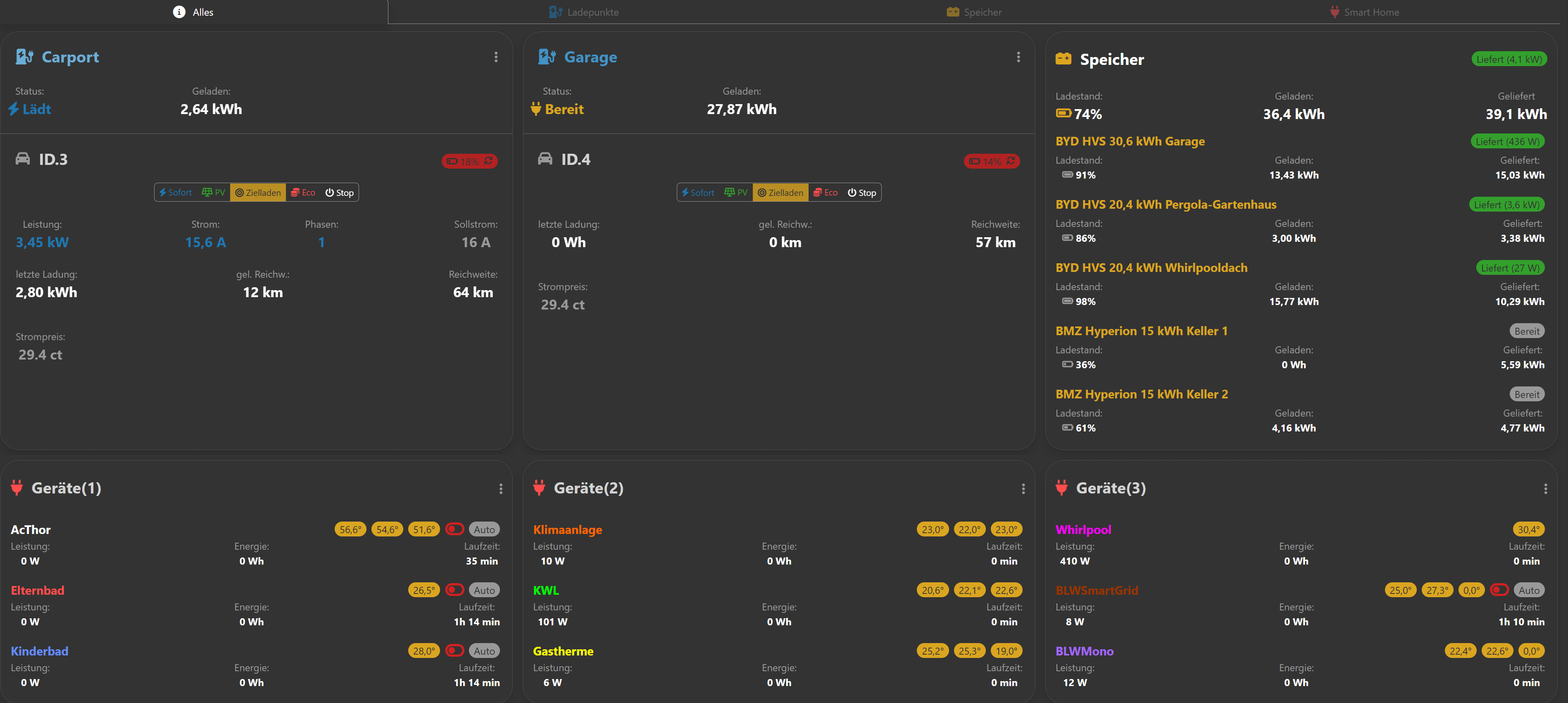Abends zwischen 18:15 Uhr und 18:45 Uhr müsste noch genug Überschuss (Mindest-SoC Speicher über 94%, 1kW Entladeleistung) für 1-pasiges Laden vorhanden gewesen sein.