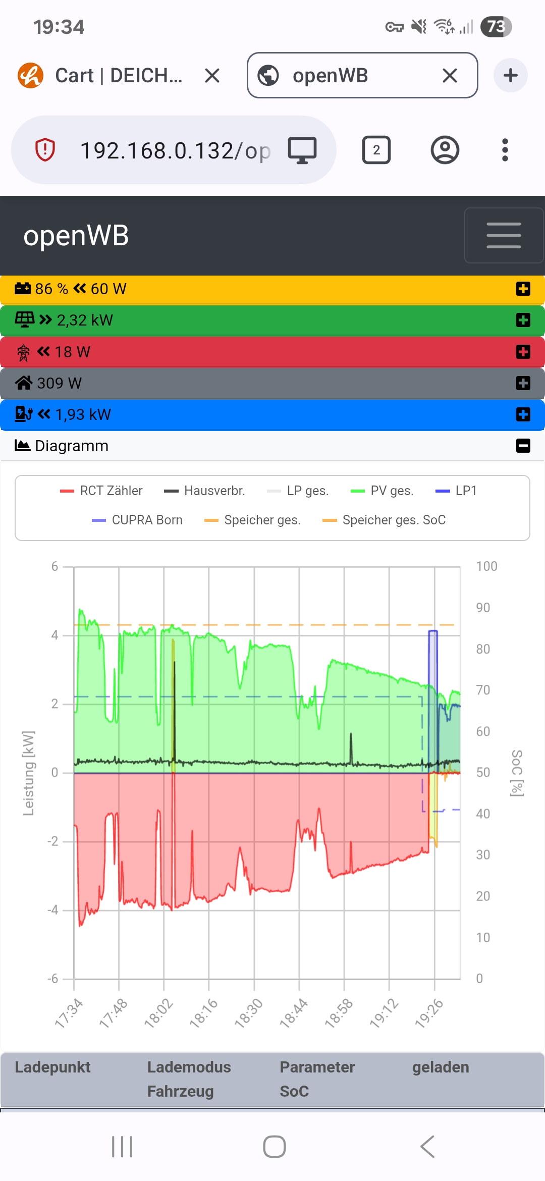 Abends zwischen 18:15 Uhr und 18:45 Uhr müsste noch genug Überschuss (Mindest-SoC Speicher über 94%, 1kW Entladeleistung) für 1-pasiges Laden vorhanden gewesen sein.