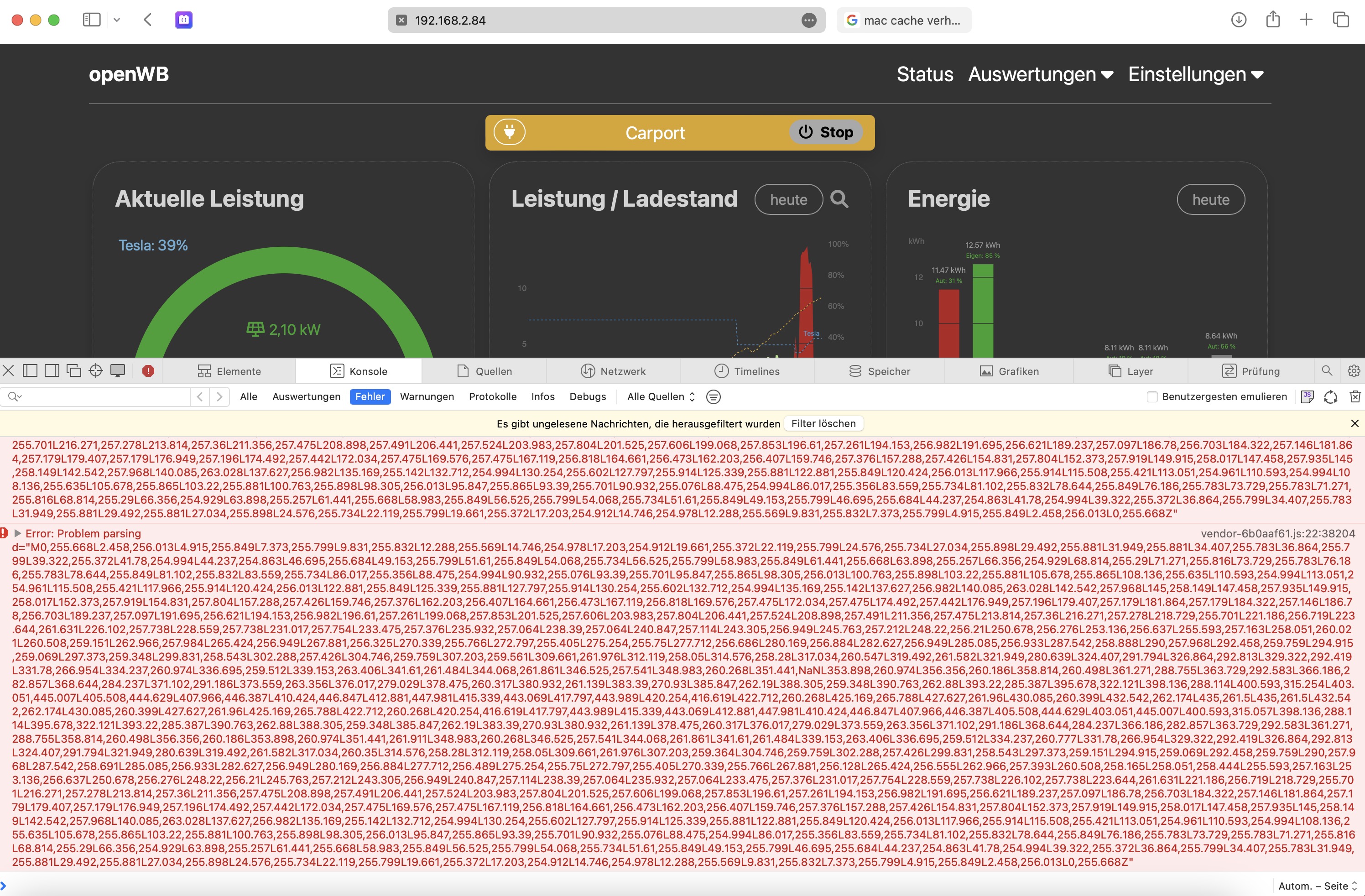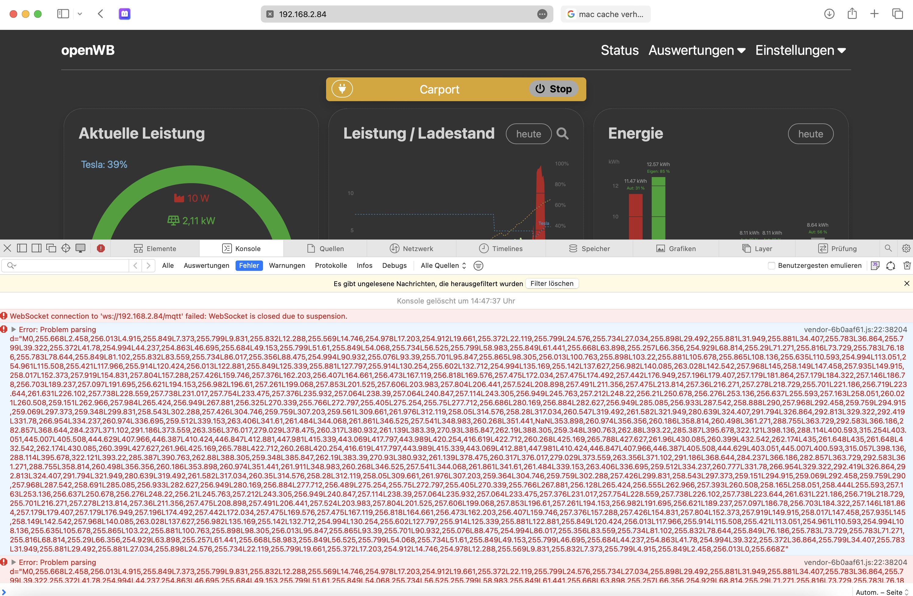 Meine Vermutung für die Fehler beim Aktualisieren des mittleren Graphen ist ein Abbruch der Websocket-Verbindung. Die MQTT-Pakete werden über eine Websocket-Verbindung zwischen dem UI und der openWB geschickt. Wenn das UI eine Zeitlang nicht erreichbar ist (weil es nicht sichtbar ist und temporär deaktiviert wurde), bricht der Server die WebSocket-Verbindung ab. Wenn das UI dann wieder aktiv ist und versucht, MQTT-Nachrichten zu senden oder empfangen, fehlt ihm die Verbindung. Ich habe aber noch nicht herausgefunden, wie man das verhindern kann.