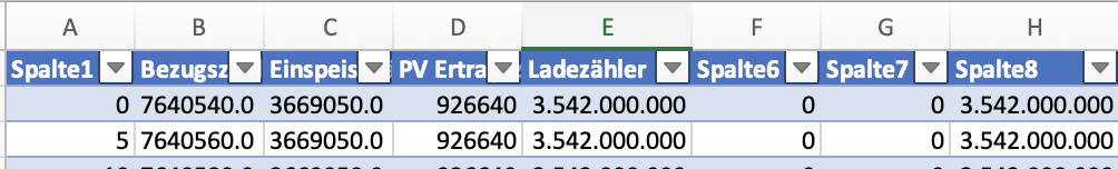 Dort gibt es grundsätzlich auch noch deutlich mehr Daten, da die Spalten der CSV aber nicht beschriftet sind weis ich nicht, an welcher Stelle was sind (bei mir sind alles Nullen). Ich gehe aber eigentlich davon aus, dass zumindest die Ladeleistung der LP, vielleicht auch die SoCs dort auch vorhanden sind. Wenn mir also jemand sagt, wo in der CSV die entsprechenden Daten liegen (CSV mit Status-Seite vergleichen) kann ich gerne auch Graphen zu den Auto-spezifischen Werten integrieren.