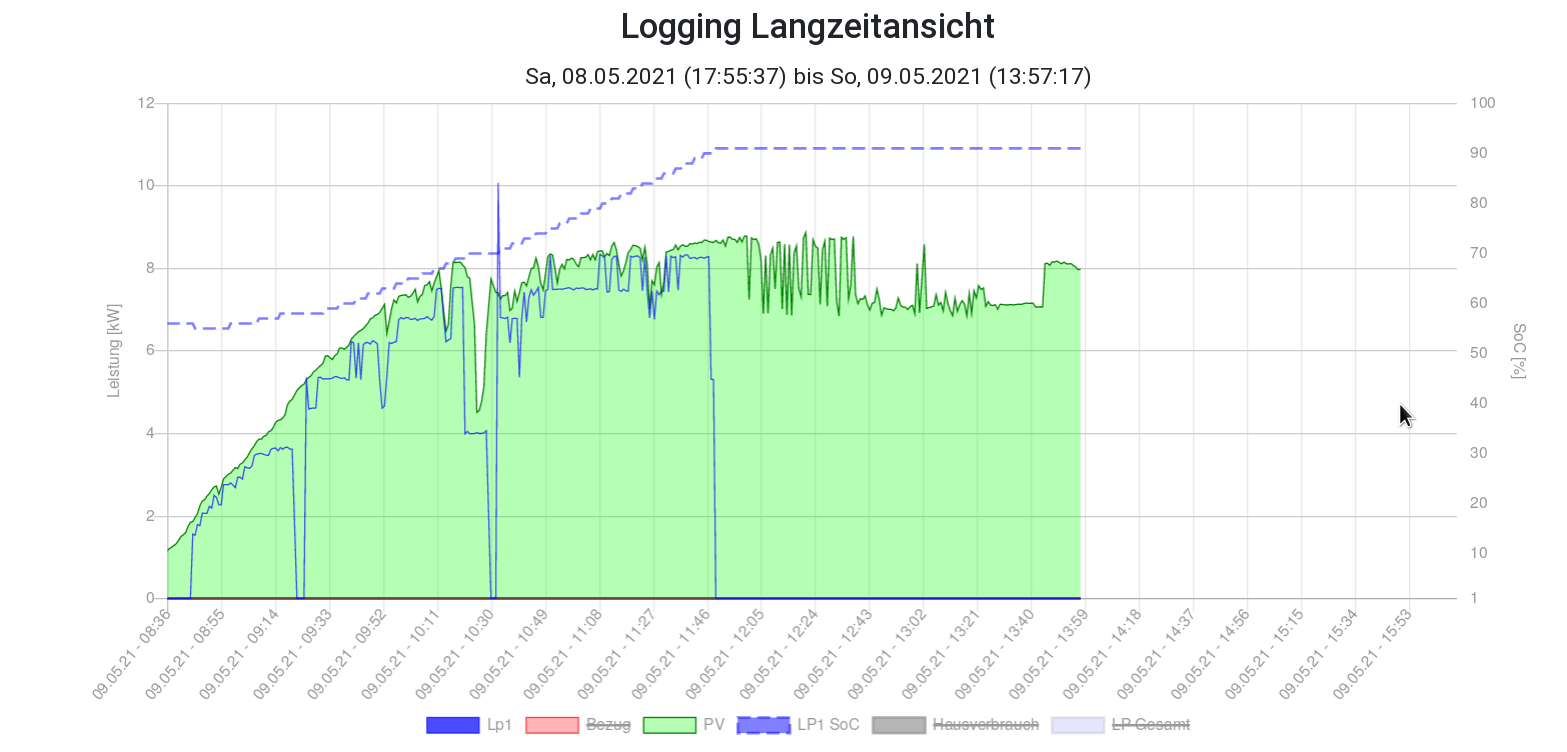 Das Auto hat gestern geladen und war deshalb immer noch angesteckt mit Lademodus nurPV. Heute Morgen hat das Fzg. angefangen einphasig zu laden und hat dann problemlos innerhalb von 4 Minuten auf 3 Phasen umgeschaltet. Auch ein Abbruch mangels ausreichenden Stroms wurde vom Fzg. klaglos weggesteckt.