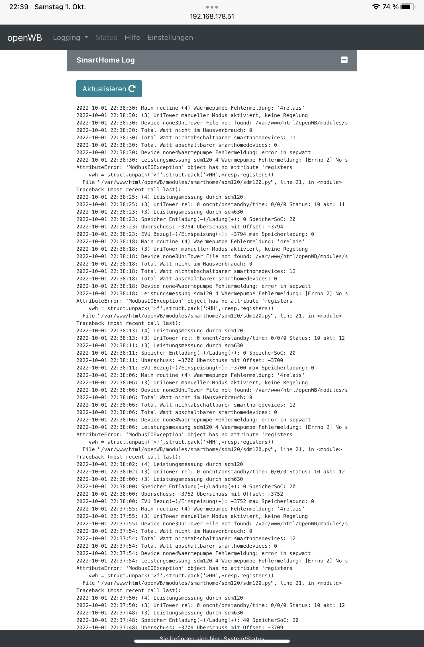Hier die OpenWB Oberfläche. Der 120er scheint irgendwie nicht korrekt eingebunden zu sein mit 0 Watt und warum ist der UniTower mit über 550watt rot anstatt grün gekennzeichnet