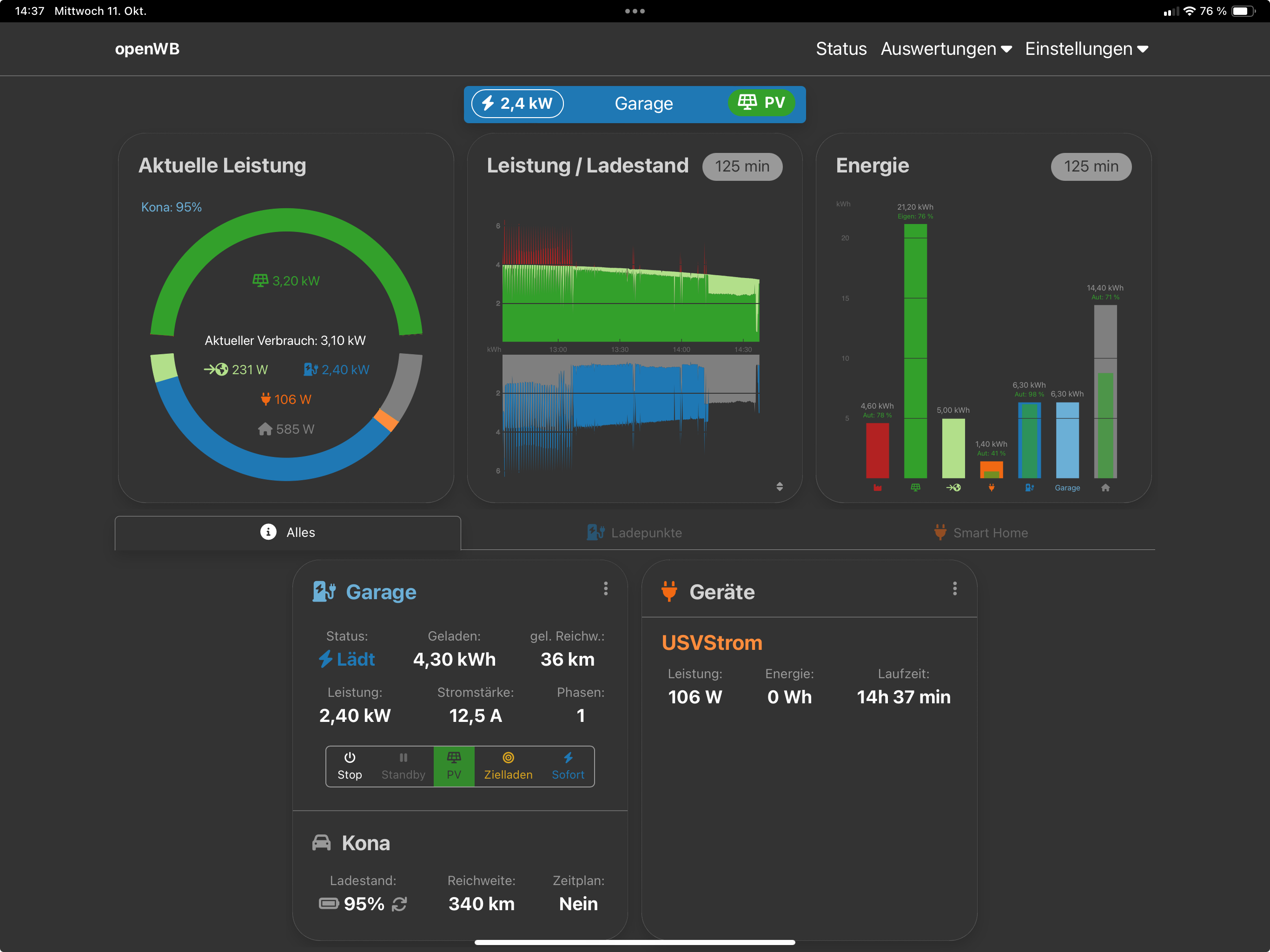 3. Im "Leistung/Ladestand" Bereich flackert nach kurzer Zeit der Graph. Ich weiss nicht wie ich es erklären soll. Es scheint als würde sich der Graph immer wieder neu aufbauen/laden. Wärend ich das hier schreibe habe ich das Dashboard bei meinem iPhone und iPad geöffnet, das "Flackern" tritt bei beiden gleichzeitig auf. Immer wieder mal für einige Sekunden, dann ist es weg und kommt dann aber wieder. Mittlerweile recht häufig...