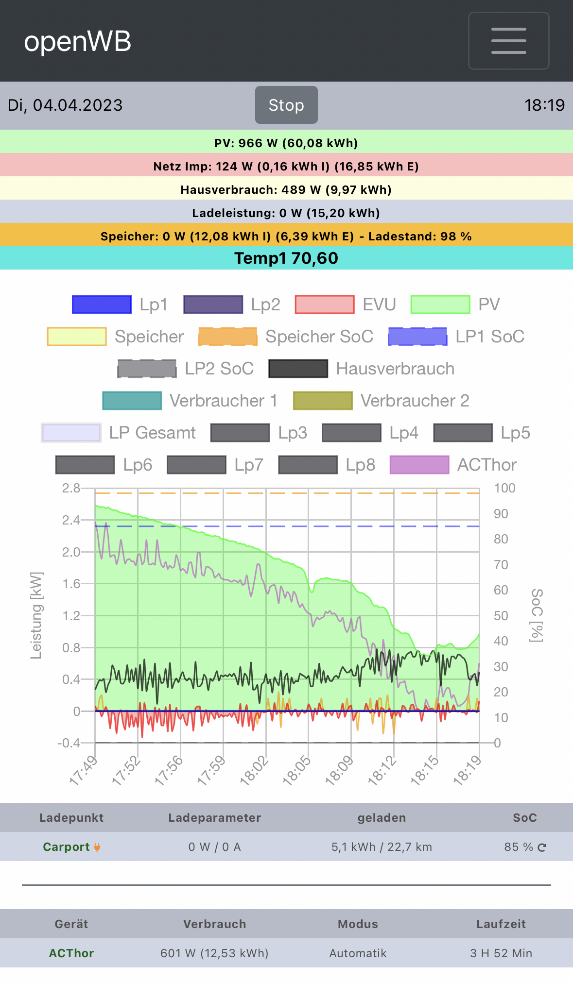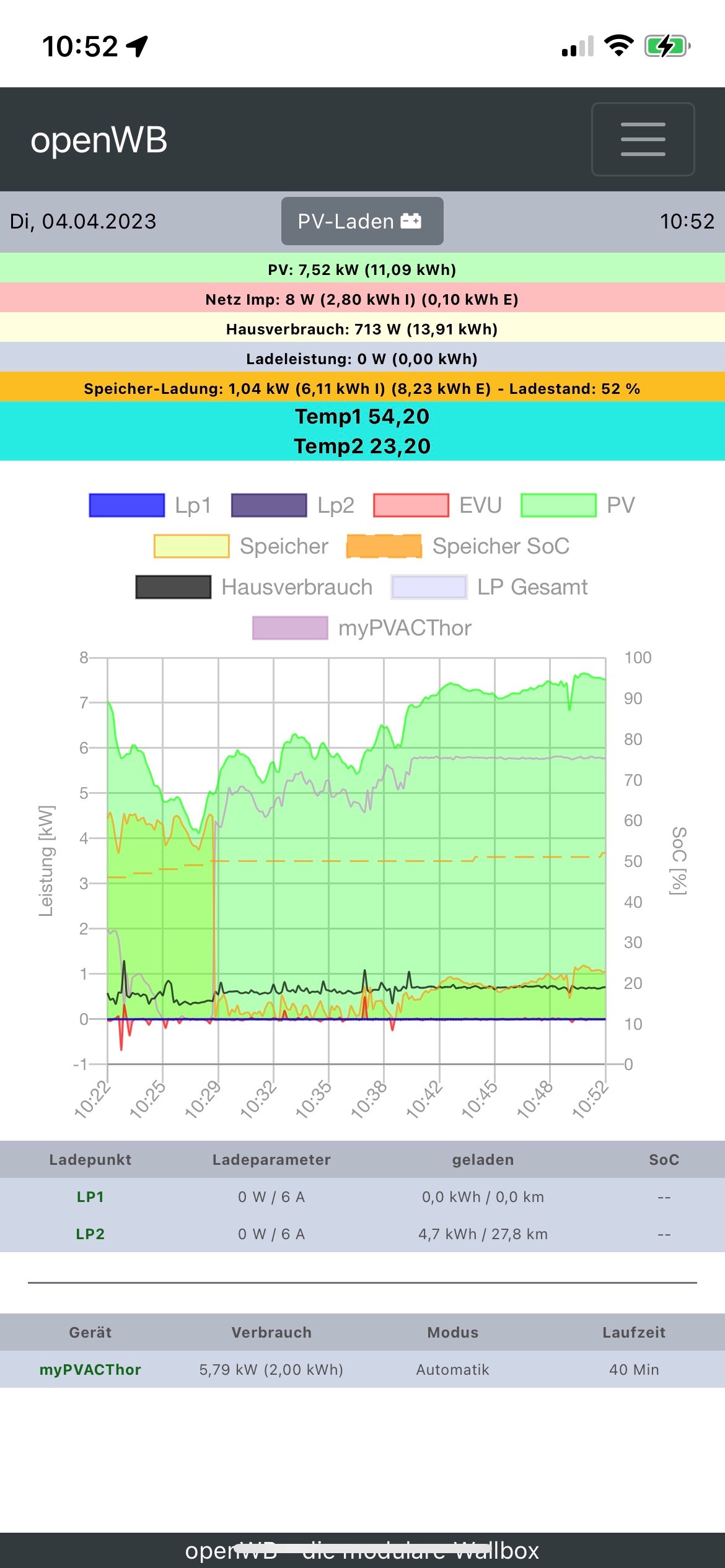 Im ersten Bild sieht man wie um 10:29 der Speicher die 50% erreicht hat. Ab dann regelt der Acthor dem PV Überschuss ordentlich nach.