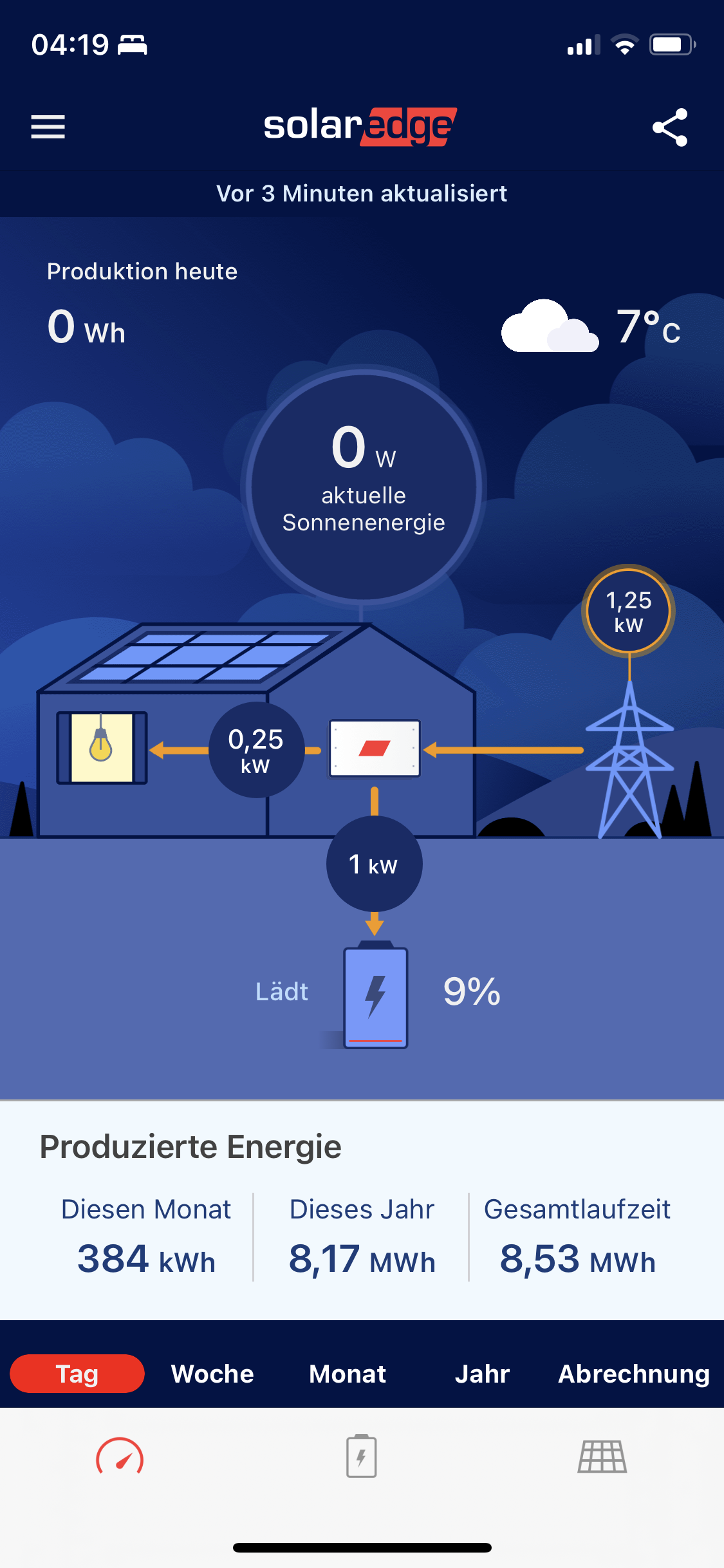 Ich denke, es ist unstrittig, dass um 4 Uhr in der Nacht keine Leistung auf dem Dach sein kann - und die Batterie war ja auch „leer“ (SoC <10%).