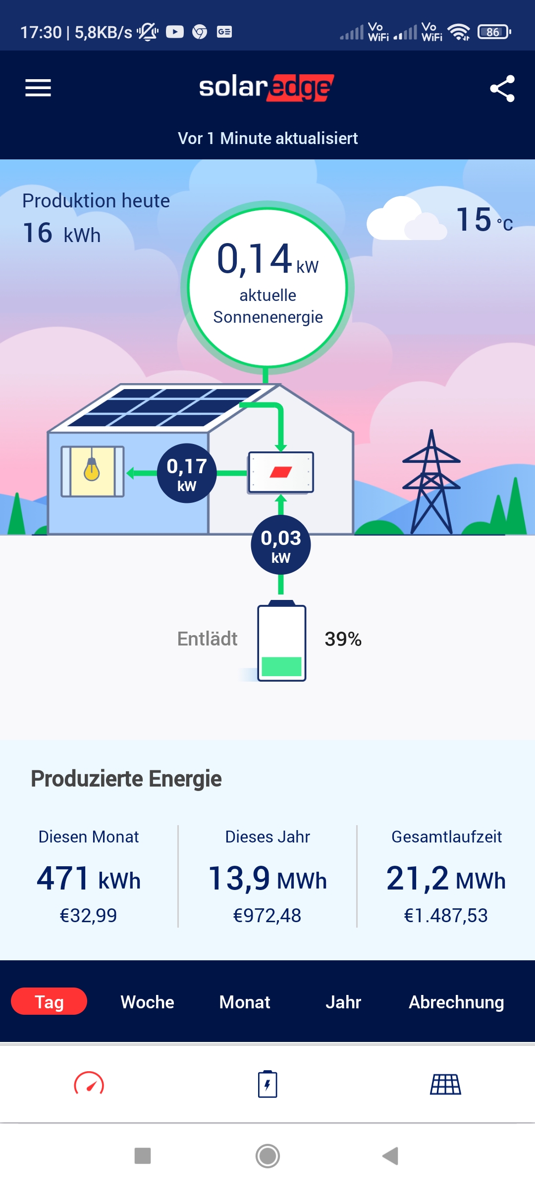 Wie auch immer das BMS von BYD mit dem SolarEdge-Wechselrichter Daten austauscht - die SE-App muss diesen Fall zumindest berücksichtigen, da es dort ja korrekt angezeigt wird.Bogie hat geschrieben: Do Okt 20, 2022 8:48 am Dabei wird dem WR vorgegaukelt, das 1kW PV Überschuss vorhanden ist.