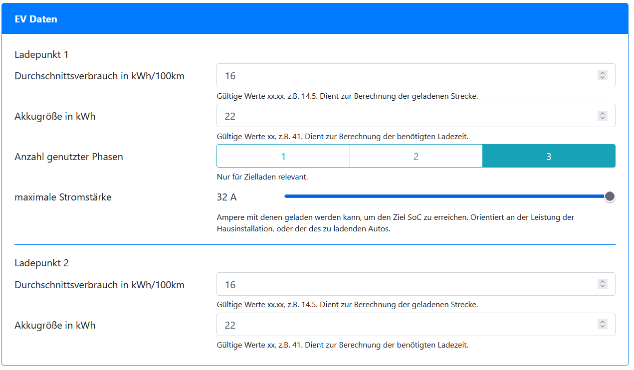 auf "Stop" und wieder zurück auf "Sofortladen" startetet den Ladevorgang. In den Loggs ist nichts auffälliges zu sehen. Jedoch wundert mich, dass in den Einstellungen ein Teil zu fehlen scheint. Beim Ladepunkt zwei fehlt die Anzahl der Phasen und der maximale Ladestrom - ist das normal?
