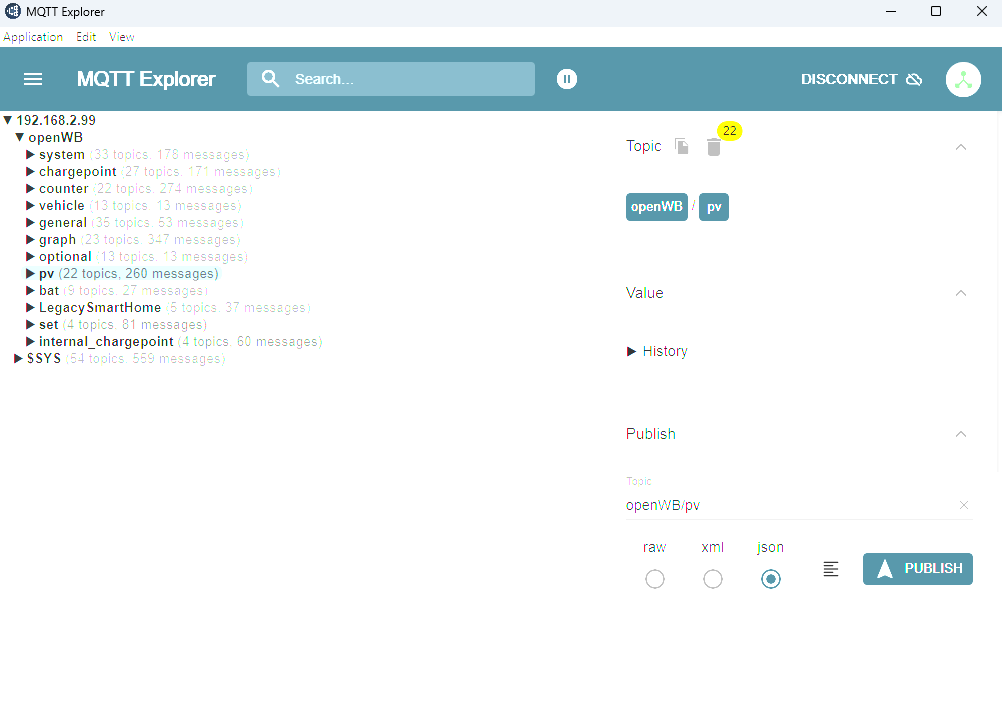 - Im MQTT Explorer seh ich bei Verbindung zum HA auch das openWB Topic mit allen Werten