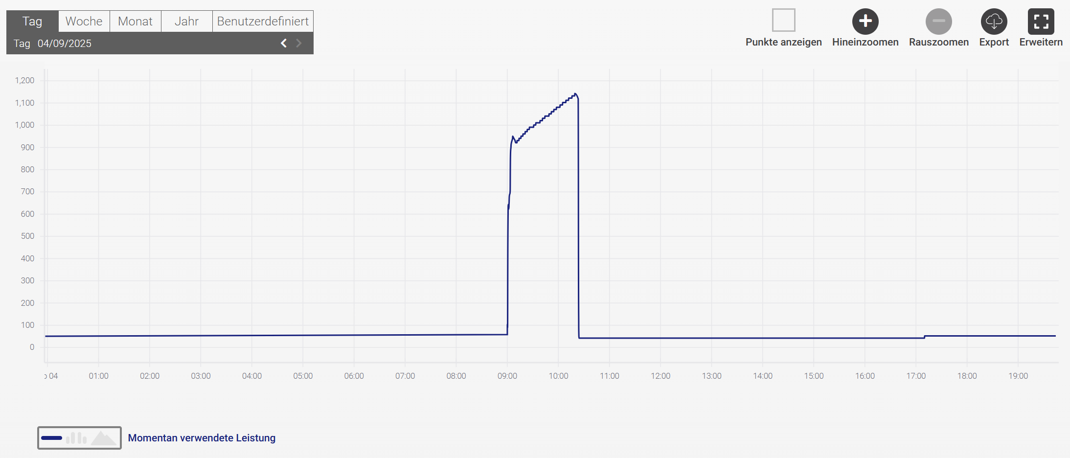 power = self.client.read_input_registers(2166, ModbusDataType.UINT_32, wordorder=Endian.Little, unit=unit)Vergleich im Verlauf (Warmwasserbereitung am Vormittag, passive Kühlung am Abend)