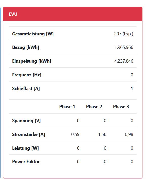 Mir ist aufgefallen, dass im Status EVU nur die Stromstärke angezeigt wird. Spannung und Leistung (und Powerfaktor) sind 0.