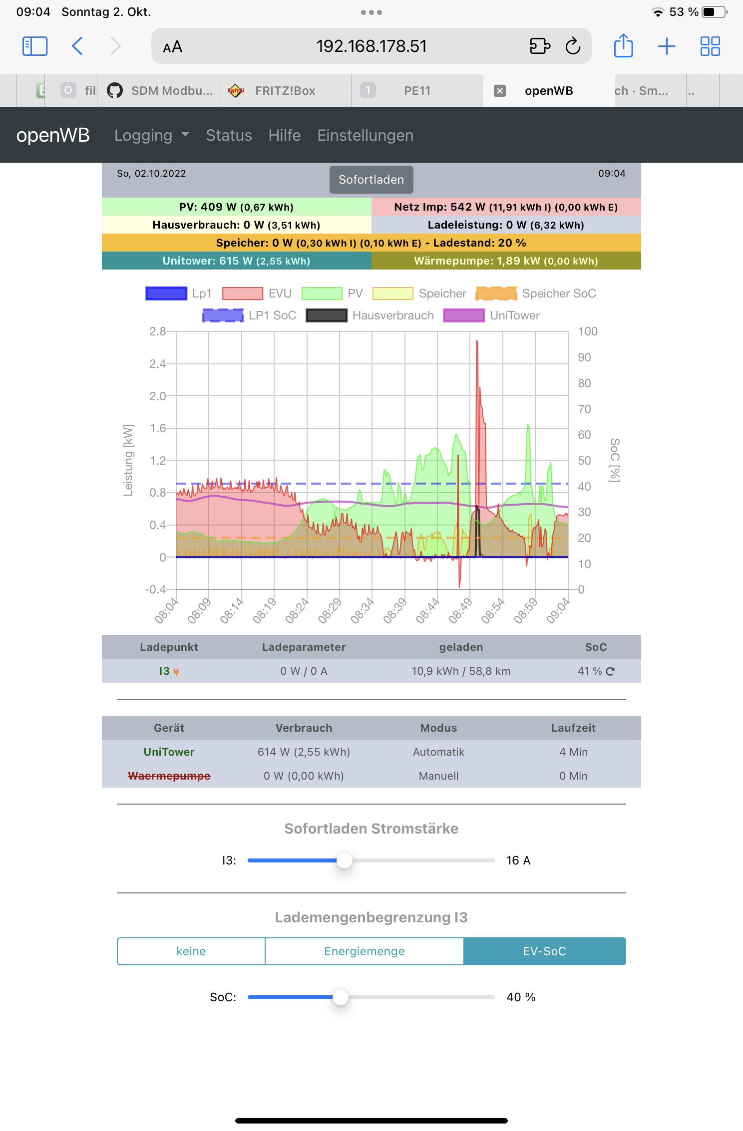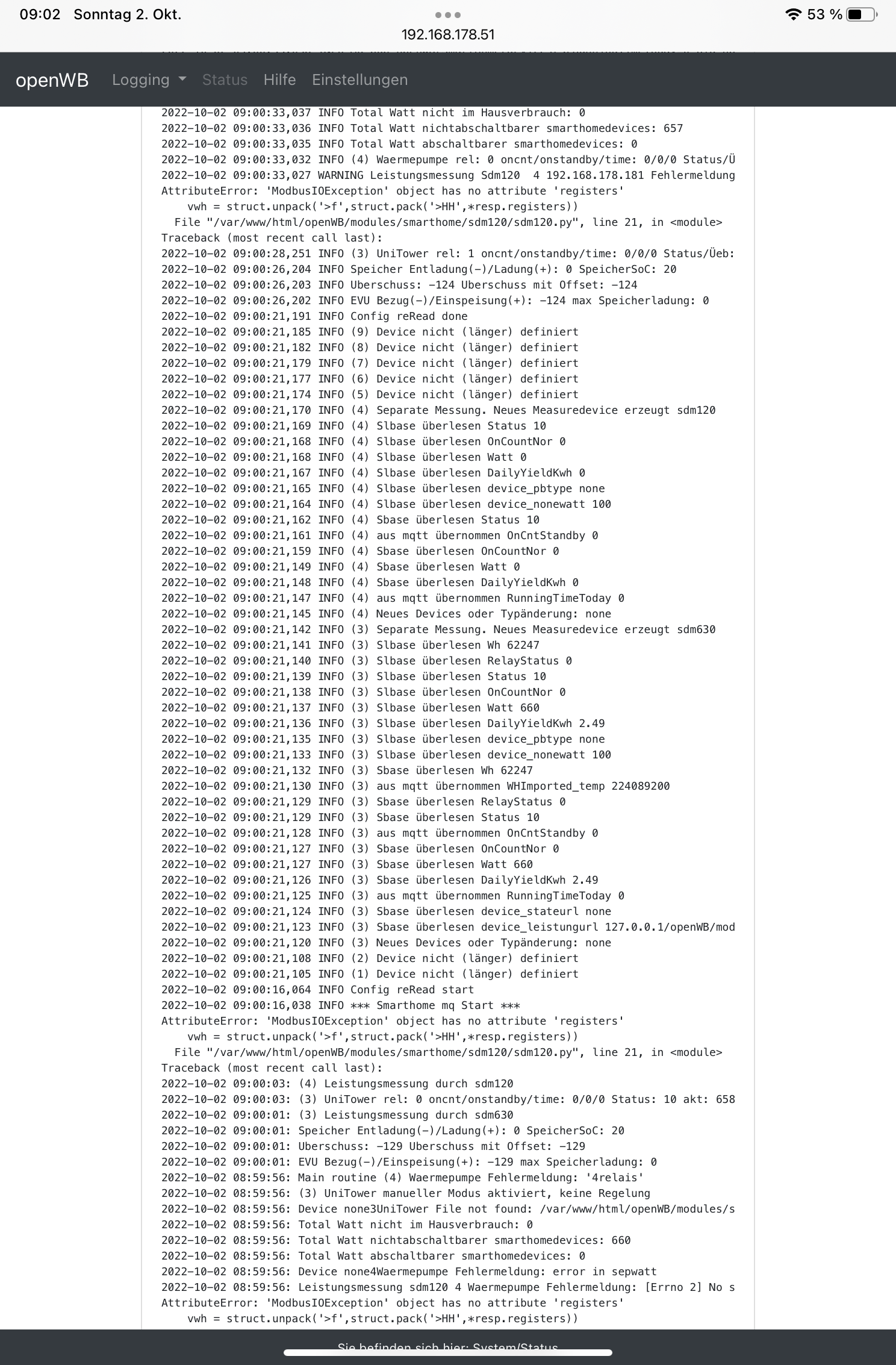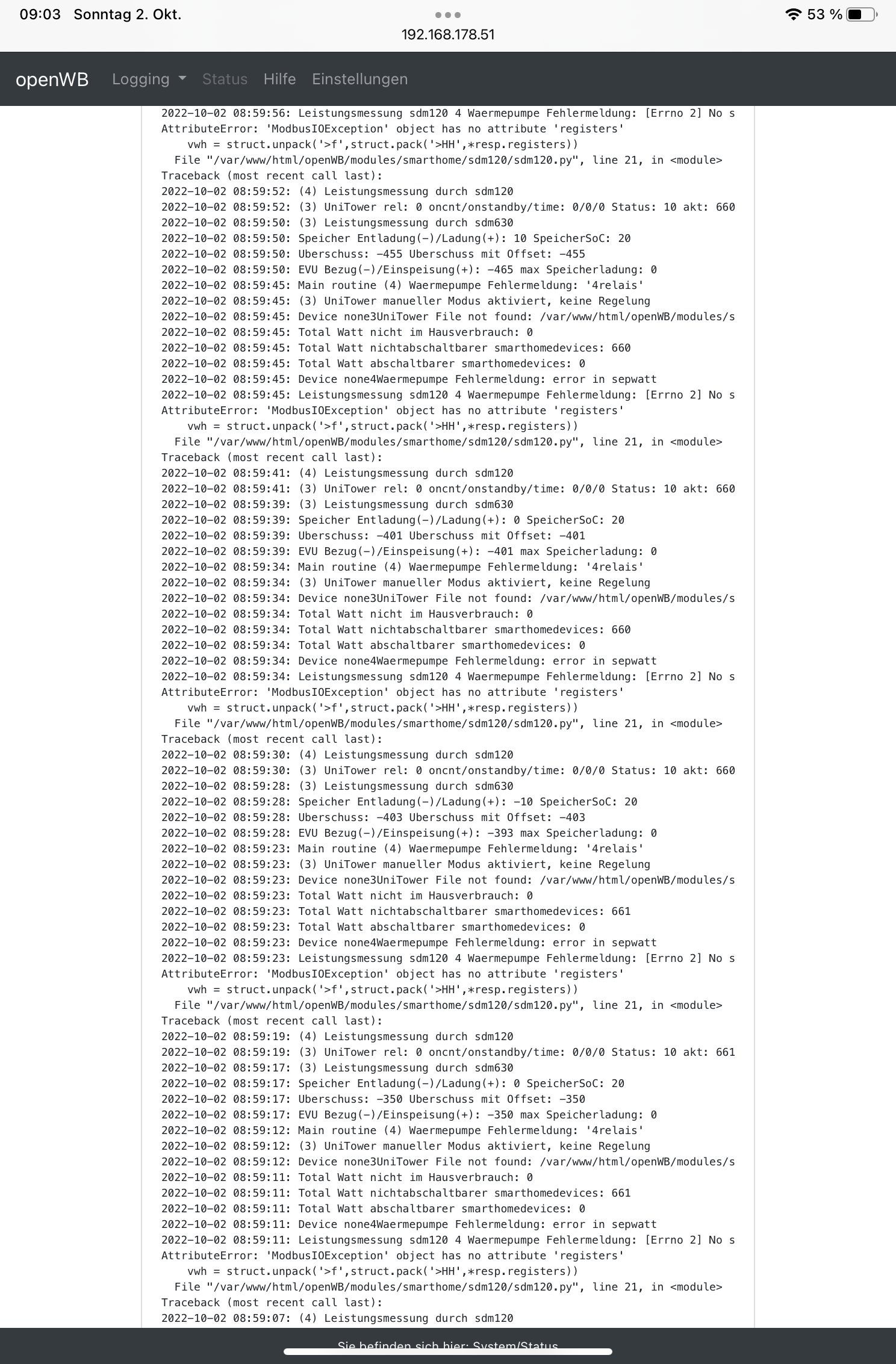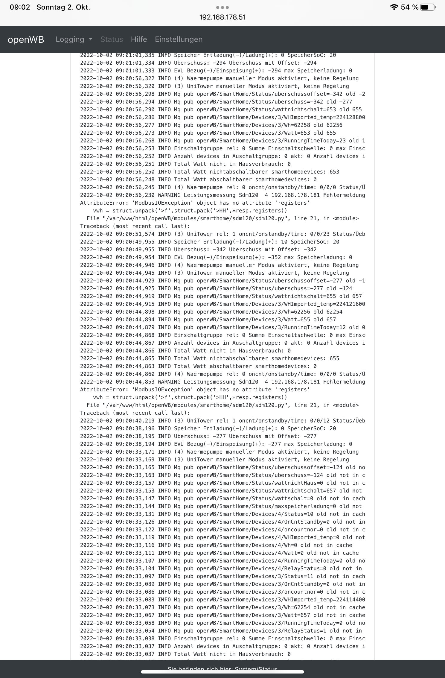 Guten Morgen Oliver, danke hier dann der neue log. Irgendwie ist komisch das der Hausverbrauch nicht mehr angezeigt wird und mit 0 ausgegeben wird. Des Weiteren unter SH die Wärmepumpe konstant mit 1,86kw obwohl der Zähler SDM120 anscheinend nicht funktioniert.