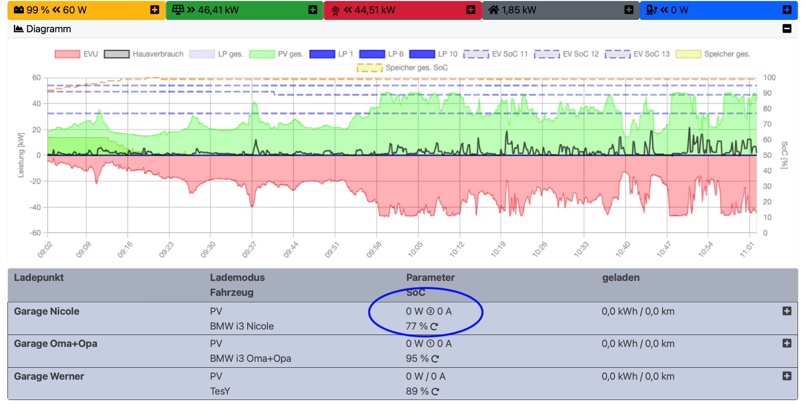 Ich antworte mir mal selber, vielleicht hilft es ja jmd.: Änderung des Lademodus habe ich nun verstanden. Hier wird der Lademodus innerhalb eines Ladeprofils geändert. Wenn alle Fahrzeuge das gleiche Profil haben, wird dieses halt für alle geändert. Ergo: in einem MFH-Szenario sollte man wohl für jeden Ladepunkt min. ein eigenes Fahrzeug UND ein eigenes Ladeprofil einrichten, dann kann individuell geregelt werden.masi79 hat geschrieben: Sa Mai 13, 2023 4:21 pm Es läuft nun soweit mit den 4 Boxen. Eine hab ich auf 1.9 gelassen, weil ich die Box nicht aufbekomme. Nach meinem Eindruck funktioniert die Regelung problemlos. Ich habe nun noch 2 Fragen: