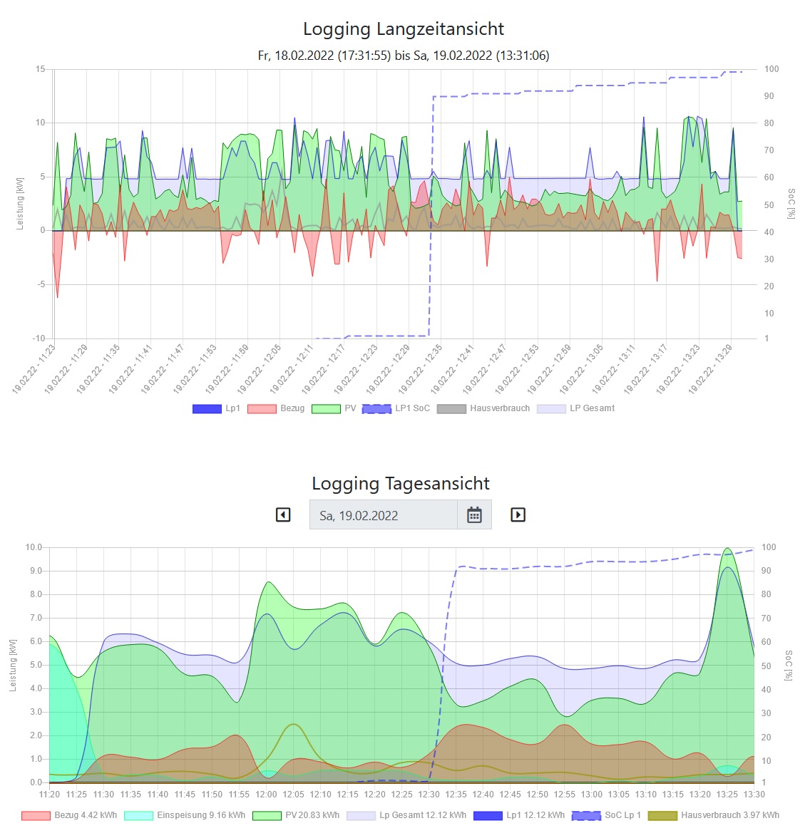 Für mich passt das soweit. Die beiden Graphen unterscheiden sich in ihrer Genauigkeit. Beim Langzeitlog werden die Daten mindestens minutengenau eingetragen. Das führt dann zu mehr Zacken. Fürs Tageslog werden die Daten nur alle 5 Minuten aufgezeichnet und der Graph ist außerdem noch geglättet.krebs8 hat geschrieben: Sa Feb 19, 2022 12:38 pm So, das erste Laden seither.