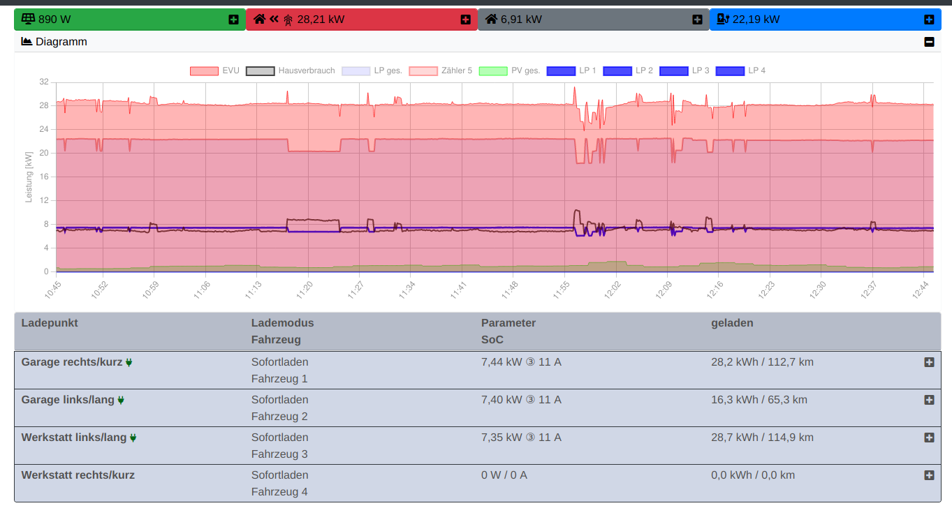 Obwohl leider so überhaupt gar keine Sonne scheint hat die openWB um kurz vor 11 gut 4kW Überschuss erkannt:Code: Alles auswählen