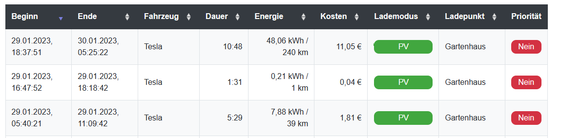 Mir ist noch etwas zum Ladeprotokoll aufgefallen, hier wird Zeitladen nicht mehr als eigener Eintrag gelistet. Auto gestern abend angesteckt, über Nacht wurde geladen, vormittags kam noch ein wenig PV Überschuss hinzu. OpenWB stand die gesamte Zeit im Modus PV Laden.