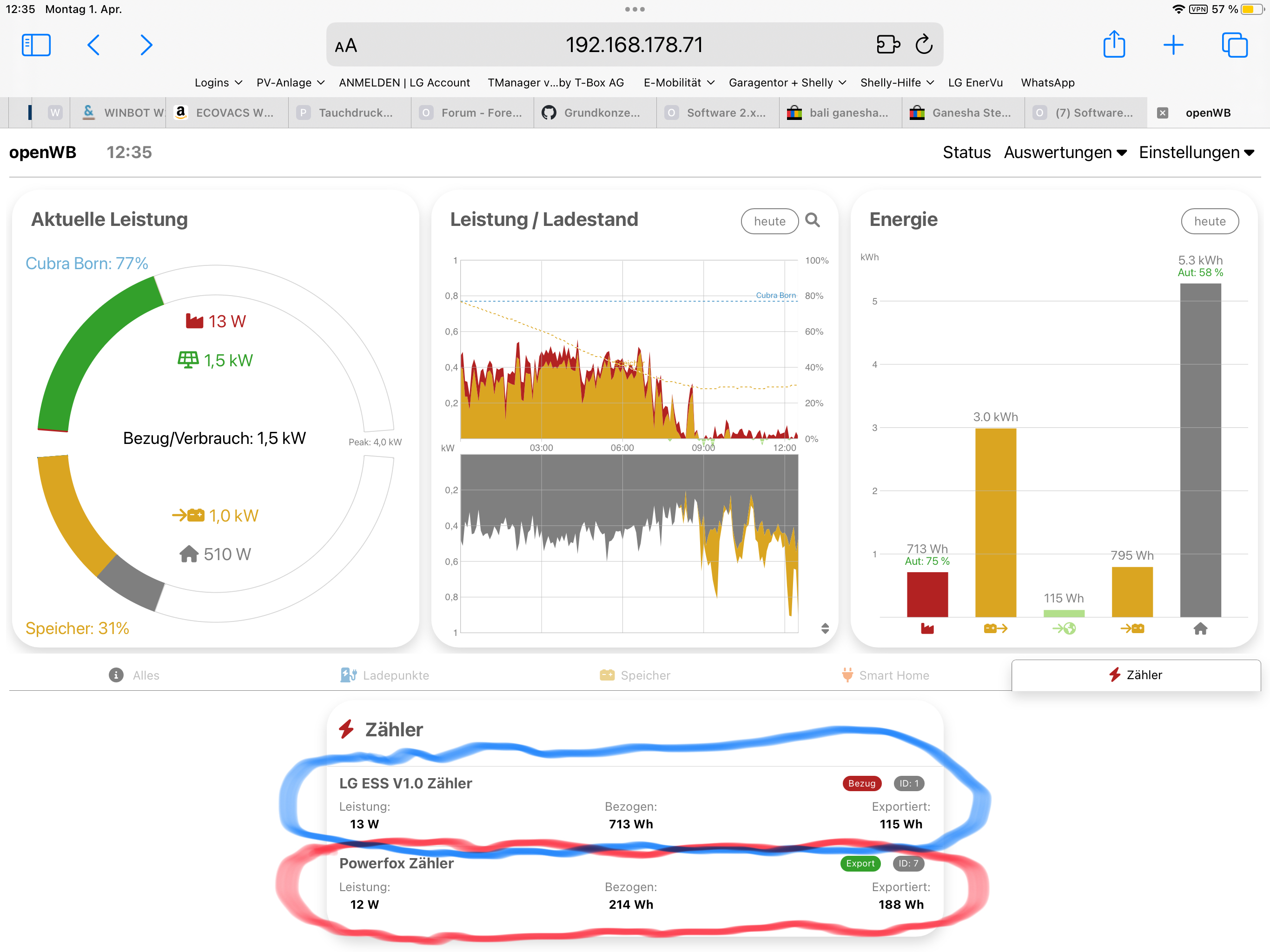 Kann mir das bitte einer erklären warum es da solche Unterschiede zwischen Wechselrichter (blau eingekreist) und Powerfox (rot eingekreist) am Stromzähler bestehen?