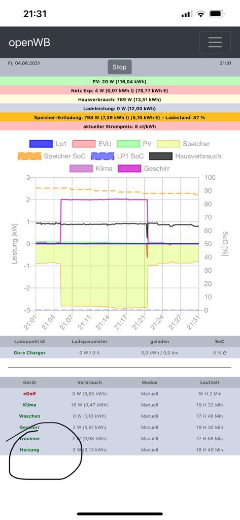 Erst wenn das Device durch openwb geschalten wird, wird diese grün. Auch dann erst wird die Laufzeit mitgeschnitten.