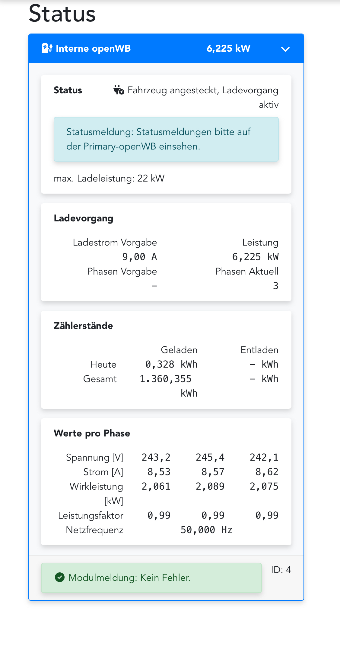 Im Status werden alle drei Phasen richtig angezeigt, siehe Anhang. Die OpenWB Pro produziert den gleichen Fehler beim ID3. Beim Kia habe ich das Phänomen nicht, einzig beim ID3.