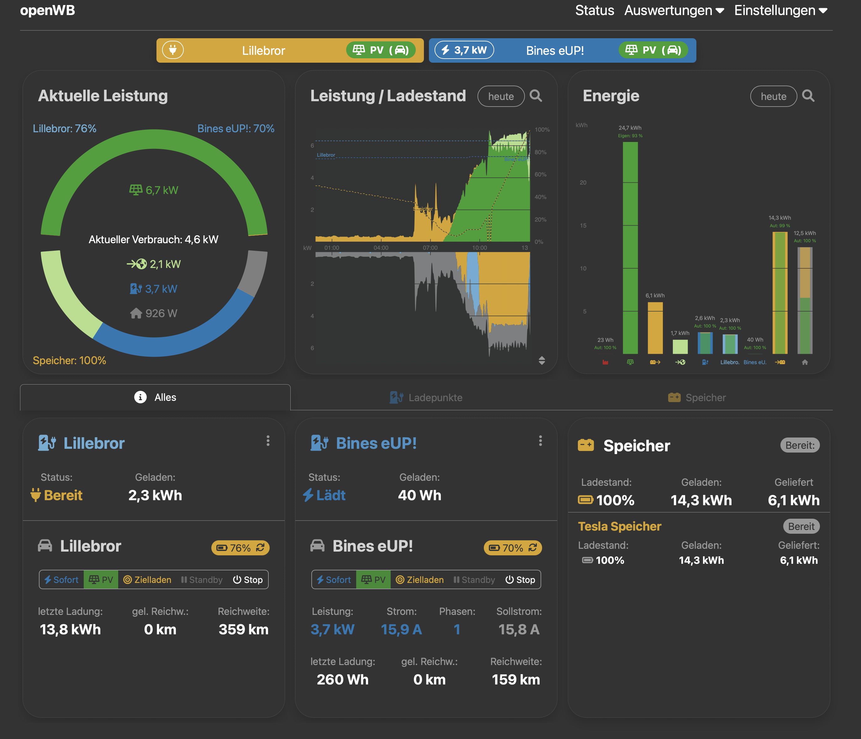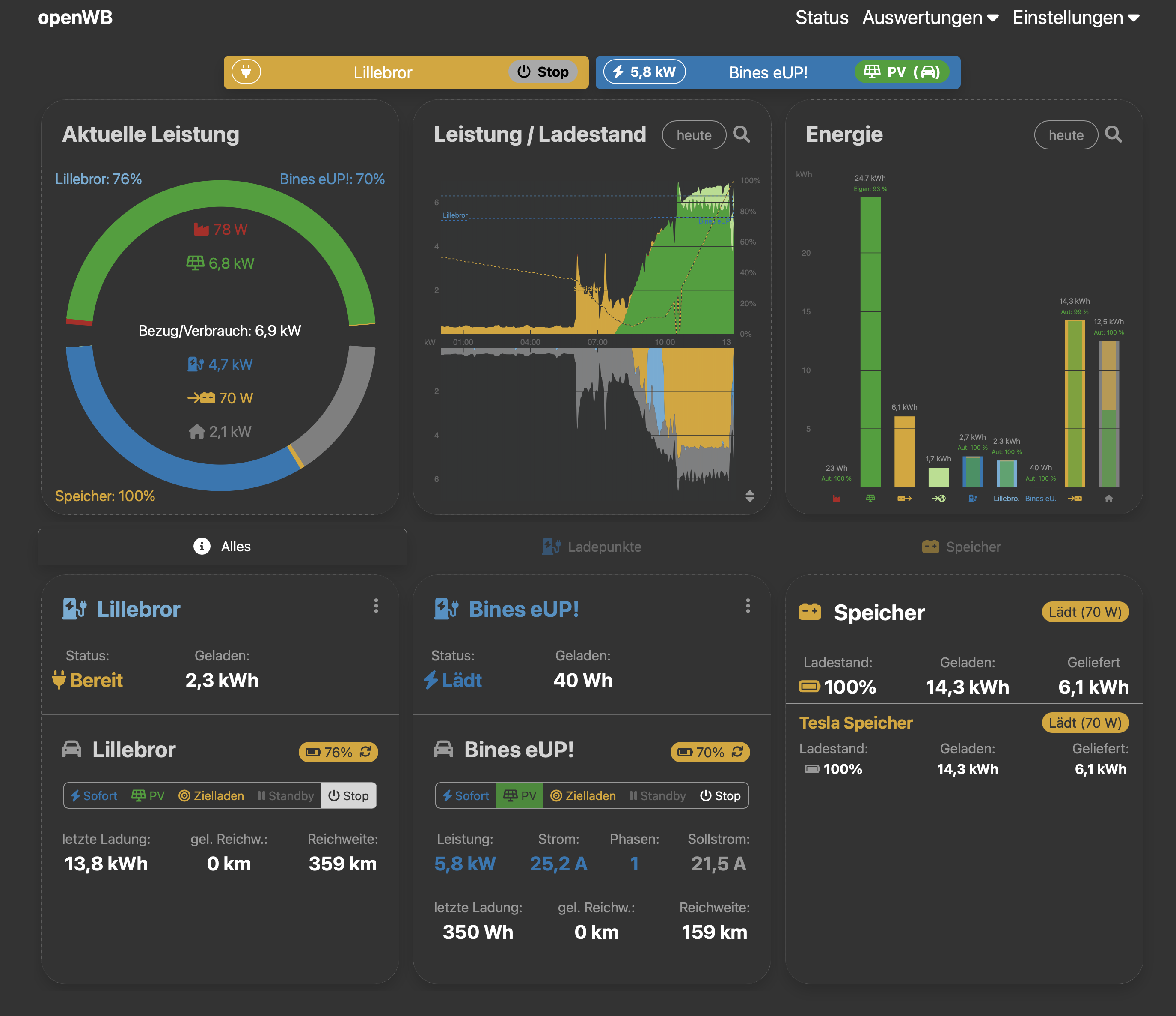 reduzierte Leistung: Hier werden 2,1 KW ins Netzt geladen; beide Lademodi auf PV