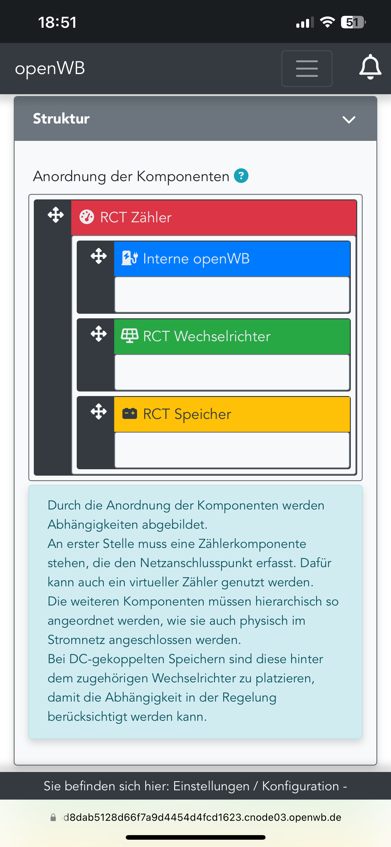 Einziger Punkt ist noch die Struktur/Hierarchie der Komponenten im Lastmanagement. Da müsste die OpenWB eigentlich ganz unten stehen, oder? Siehe Anhang.