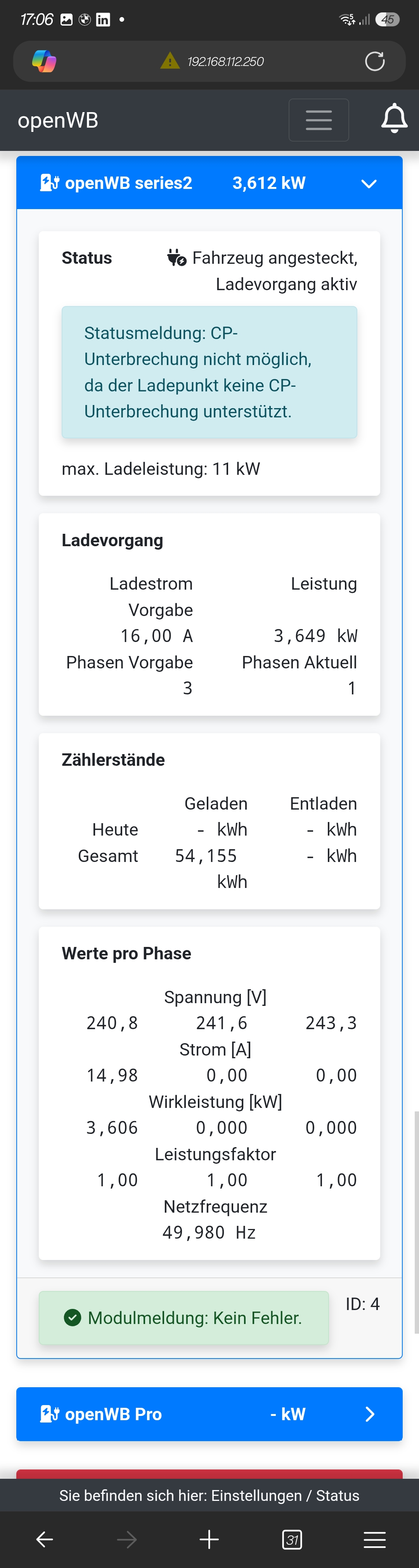 Du hast ein Auto und an der einen lädt es einphasig und an dem anderen dreiphasig? Du hast bei beiden Ladeversuchen auch das selbe Auto ausgewählt? Dann kann es an der Konfiguration nicht liegen sondern muss Hardware sein. Du kannst ja auch mal auf die Status-Seite während der Ladung schauen, da steht dann auch wieviele Phasen dem Auto angeboten werden..n3 hat geschrieben: Sa Mai 10, 2025 12:45 pm Wie gesagt, das Problem besteht nur bei der series2 und bei der Pro geht es ohne Probleme.