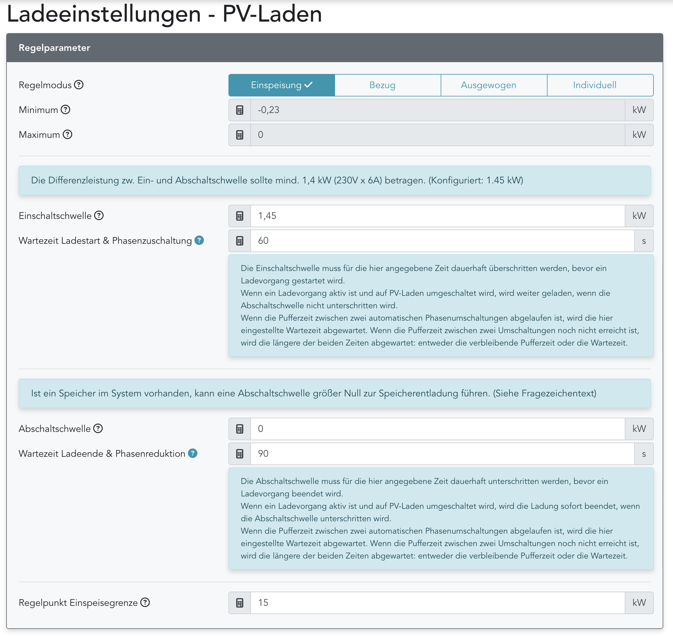 Nun stellst sich mir die Frage wieso die Einschaltverzögerung und Phasenzuschaltung gemeinsam definiert werden? Um mit einer Phase Ladung zu starten ergibt z.B. 60 Sekunden Sinn aber die Umschaltung von 1 auf 3 wäre vielleicht eine längere Verzögerung (3min?) wünschenswert.