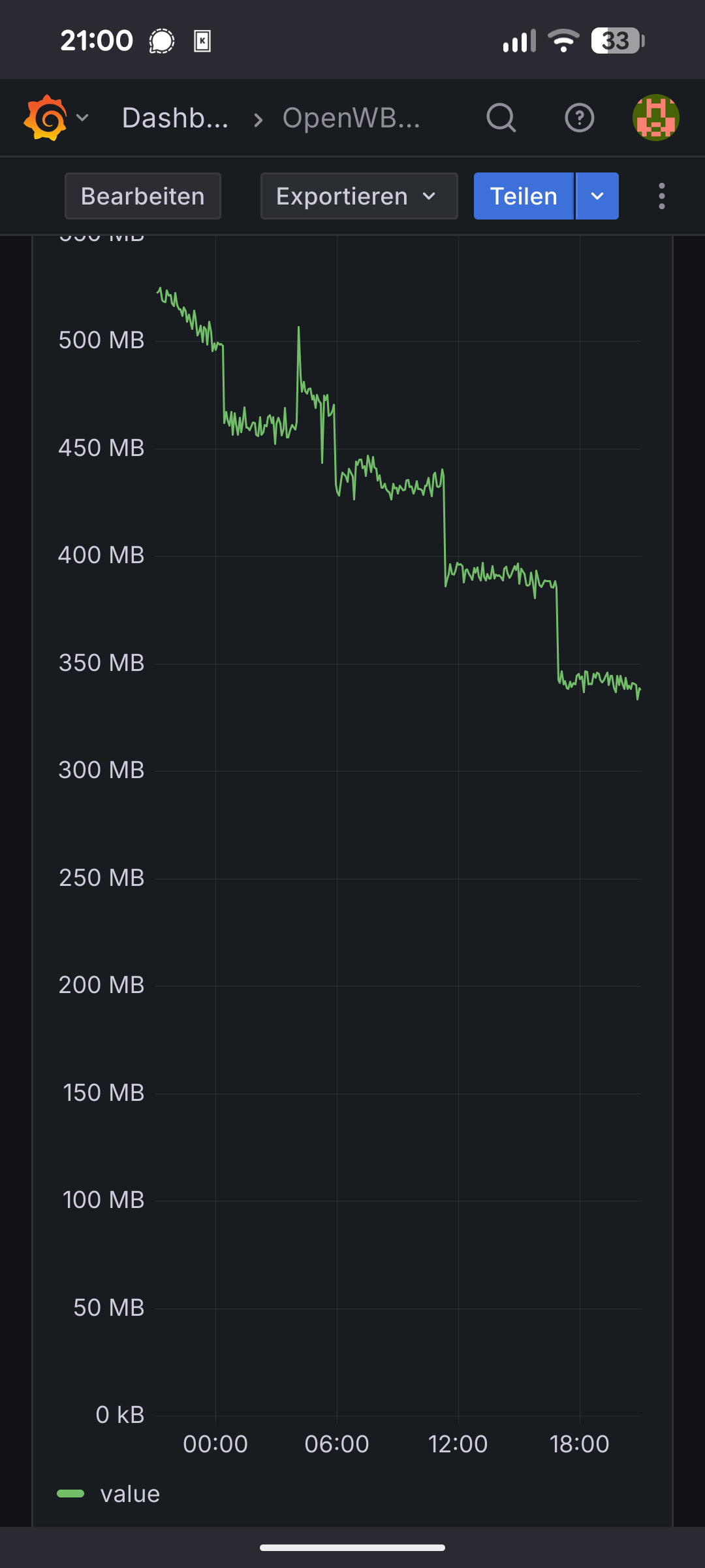 Verlauf der Speichernutzung (man sieht den Moment, wo debug aktiviert wurde, auffällig ist, dass etwa alle 5 Stunden 30 Minuten massiv Speicher allokiert wird.