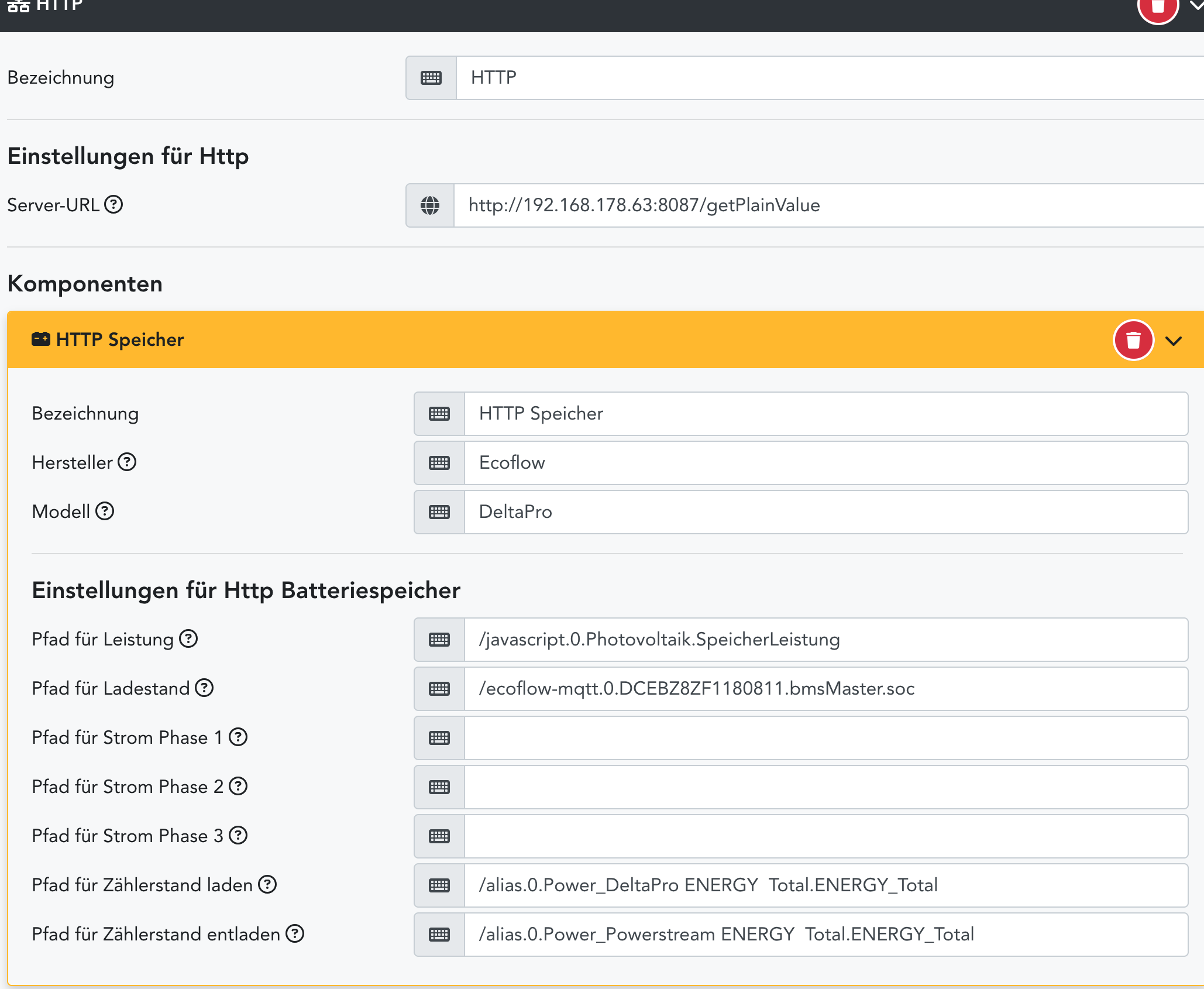 Schau mal den Anhang. Ich habe meinen Ecoflow Delta Pro so angebunden. Allerdings dazwischen den iobroker. Für einige Werte musste ich ein wenig rechnen.