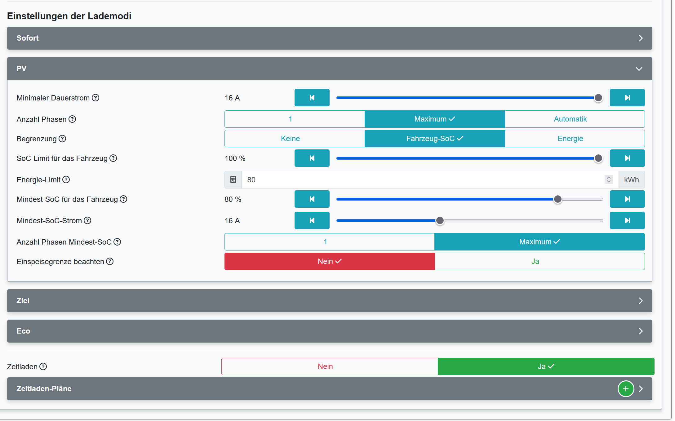 Nimm PV-Lademodus + unten das optionale Zeitladen hinzu. Für Letzters ist auch die Phasenvorgabe 1p oder Max. unabhängig von PV möglich (sw2.1.9-patch2).