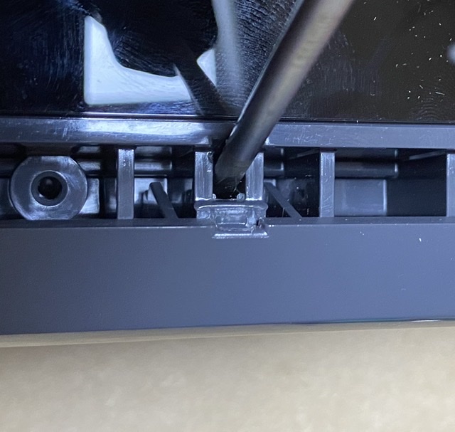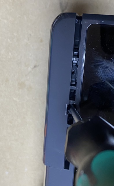 Der werkzeugbetätigte Verschluss wird vorsichtig - aber bestimmt - eingedrückt - aufgehebelt. Ein etwas breiterer Schlitz bietet sich hier an um keine Beschädigung zu verursachen.