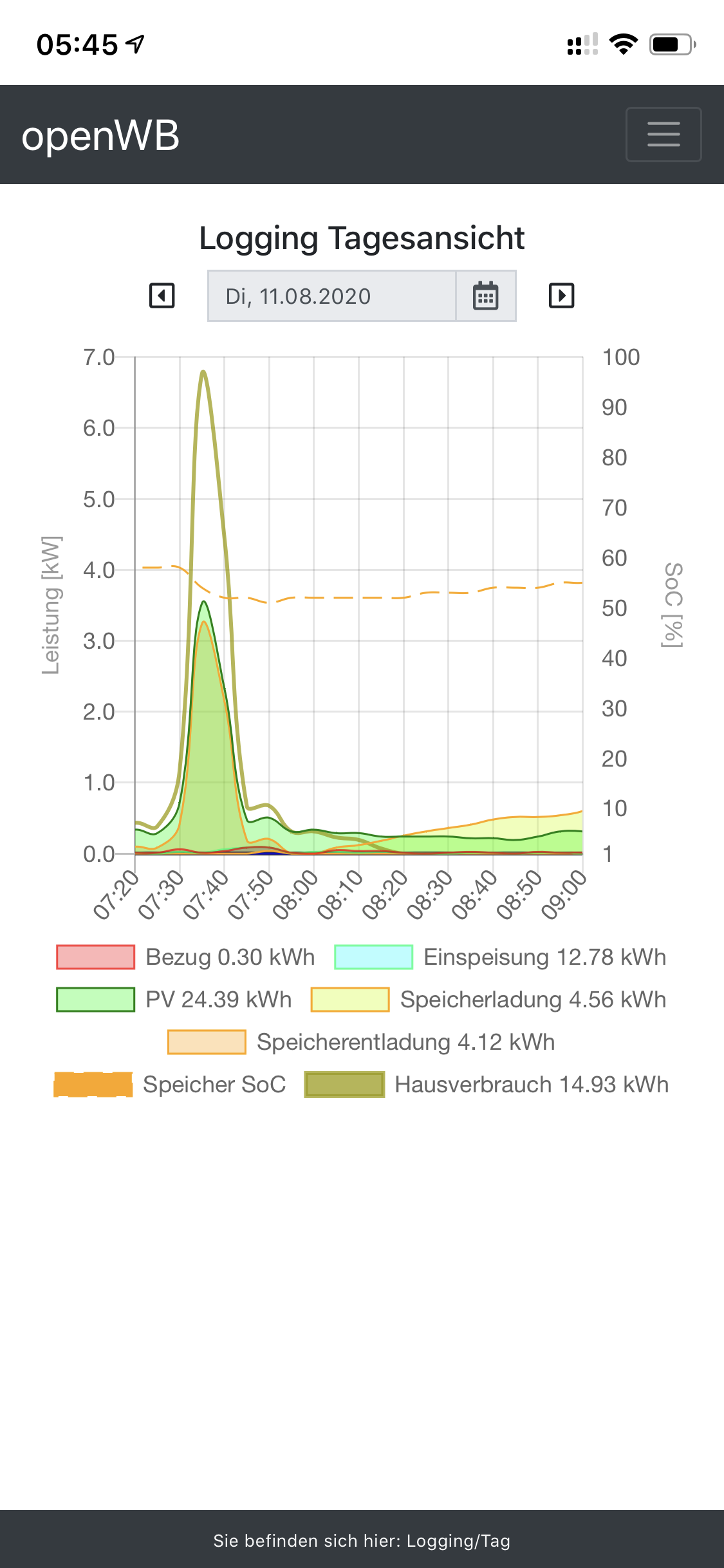 Hier sieht man ganz gut, dass nachts "Solarerzeugung", also das was der Wechselrichter erzeugt und "Spreicherentladung" addiert werden, beides ist allerdings deckungsgleich, weil ja nur soviel aus dem Speicher kommt, wie im Haus verbraucht wird.