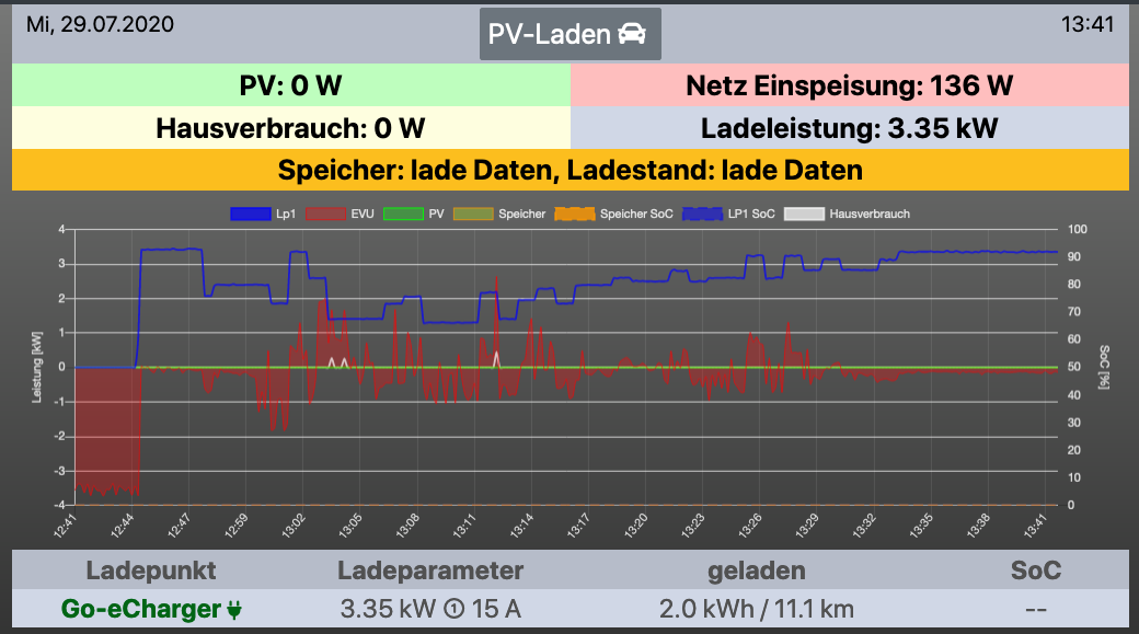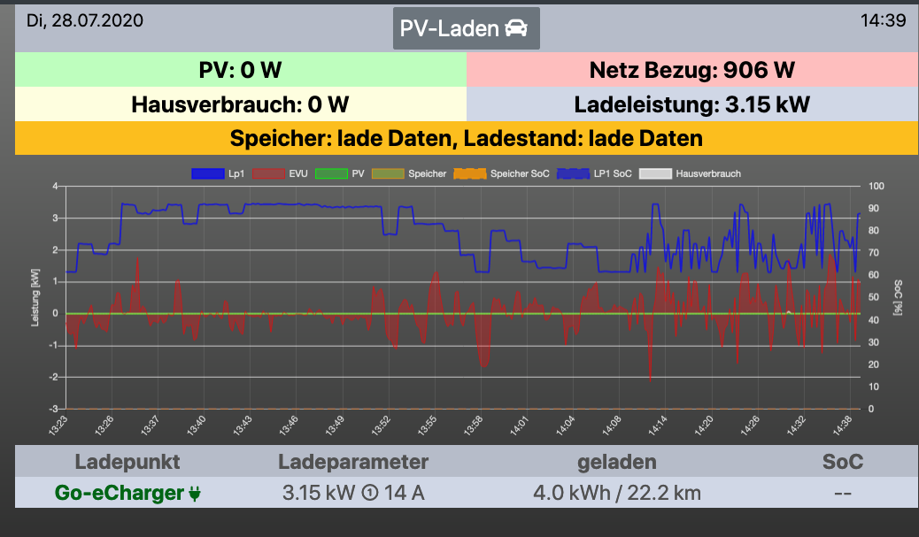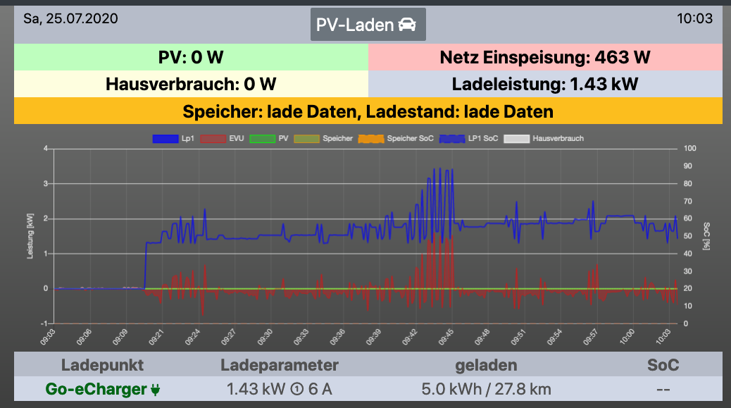Hier nun nochmal eine Kurve von einem wolkenlosen Tag, dafür ist der E-Herd um die Mittagszeit zu sehen (OpenWB Regelinterval auf "sehr langsam"):