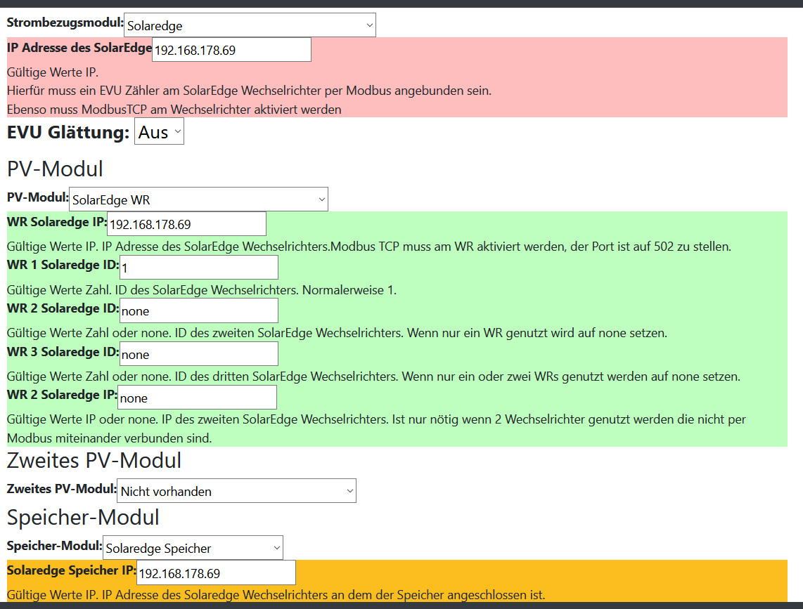 Nachdem der Solaredge Support den Modbus TCP aktiviert hat, kann ich in der OpenWB die Netzeinspeisung korrekt sehen und auch den Speicherzustand. Allerdings wird mir weder ein Hausverbrauch noch eine PV-Leistung angezeigt. In der Solaredge App habe ich für alles Werte.