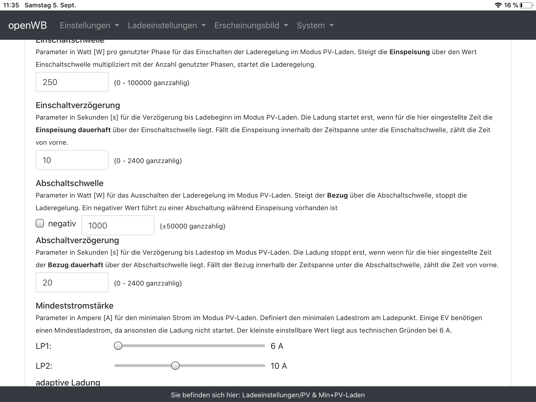 Die Abschaltschwelle habe ich auf unerreichbare 10000 W gestellt. Aber was soll diese Einstellung? Bedeutet sie, dass bei der Überschreitung diese Schwelle „Bezug“ der zusätzliche Netzbezug gemeint ist? Falls ja, dann Null. Da ich nur PV Ladung möchte.