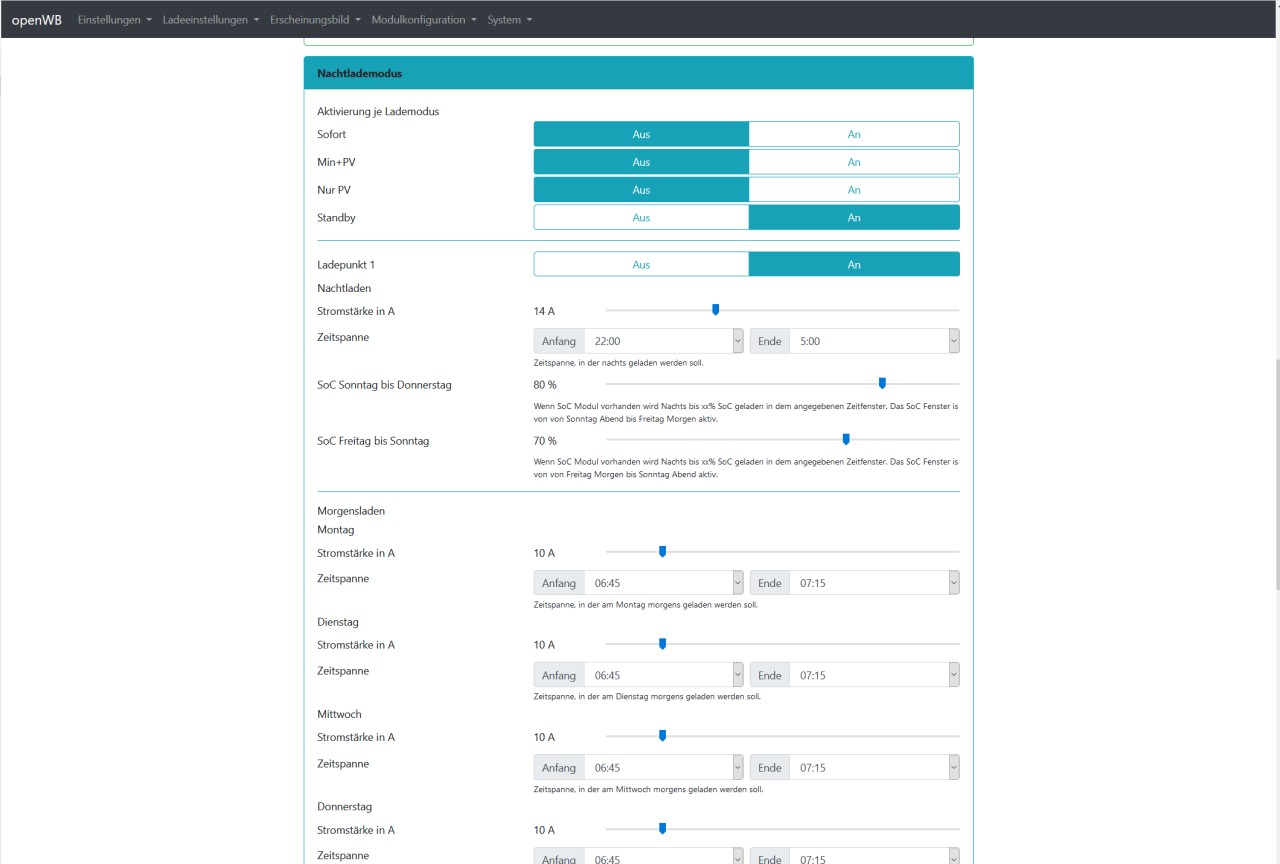 Bei anderen Einstellungen kann ich auch für jeden Tag separate Einstellungen vornehmen, was bei der Nachtladung auch wünschenswert wäre.