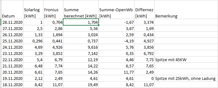 * Gegenüberstellung der Daten - die Summe passt nicht mit den Werten welche ich vom SolarLog und Fronius bekomme zusammen