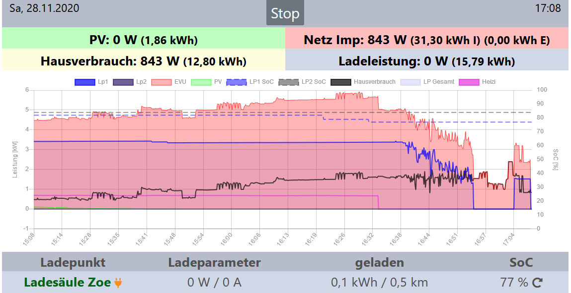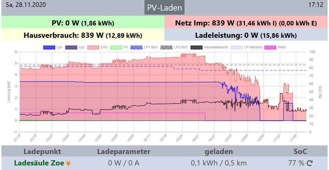 Hier habe ich mittels SOFORTLADEN ein andere Fahrzeug bis zu dessen selbständigen Abschalten geladen. Sieht man an der Ladekurve, welche zum Ende hin dann abnimmt. Danach die Fahrzeuge umgeparkt und bevor ich das nächste Fahrzeug angesteckt habe, habe auf PV gestellt. Nachdem der Modus auch angezeigt wurde habe ich etwas später angesteckt und das Fahrzeug sollte dann morgen gemütlich mittels PV-Überschuss geladen werden. Es startete aber sofort mit dem minimalen Ladestrom (8A) und lädt damit auch weiter. Das ganze trotz Vorgabe von 0A wie man auf dem Screenshot sehen kann. Ladeleistung zeigte weiterhin korrekt an, also "wusste" die openWB von der stattfindenden Ladung.