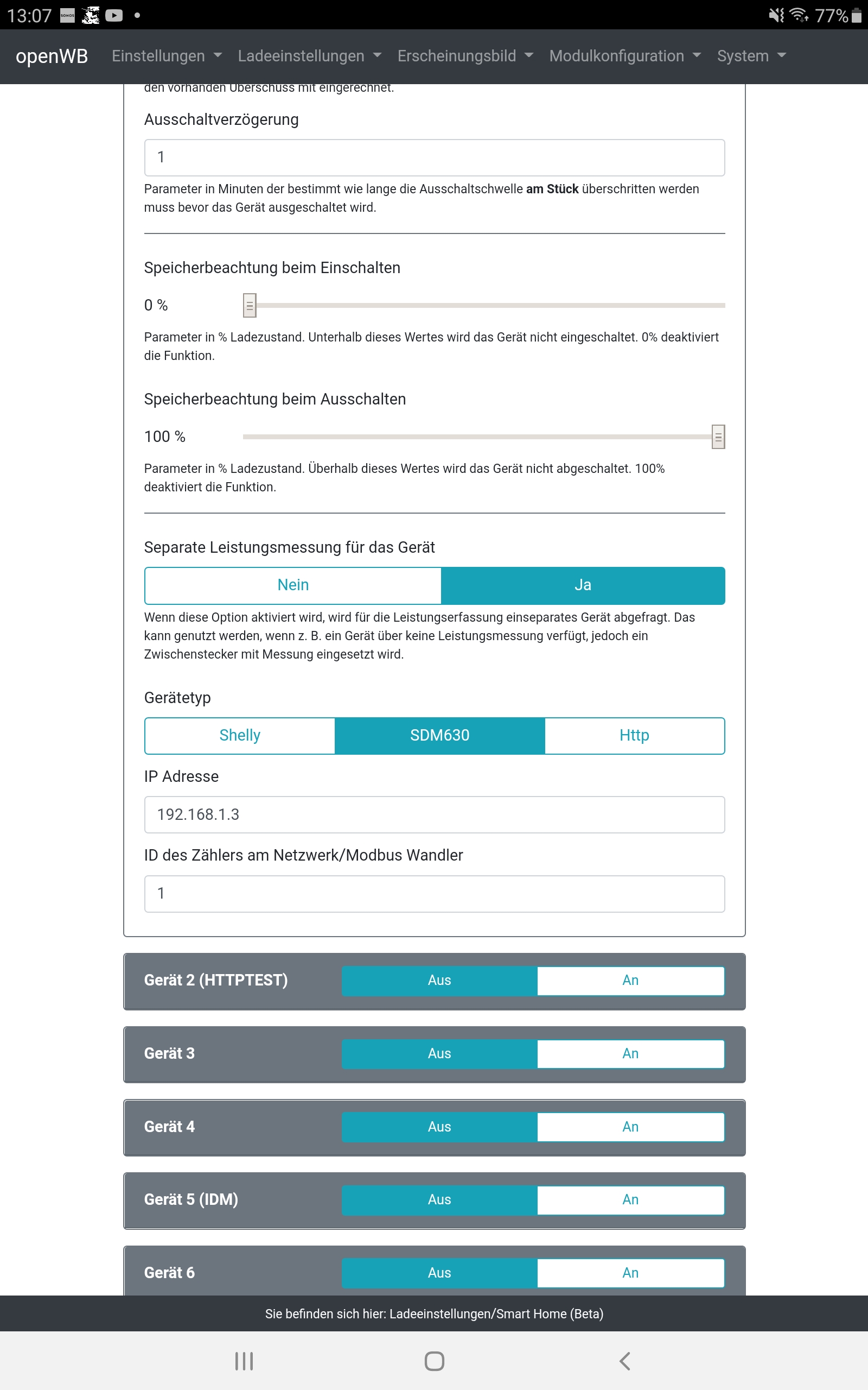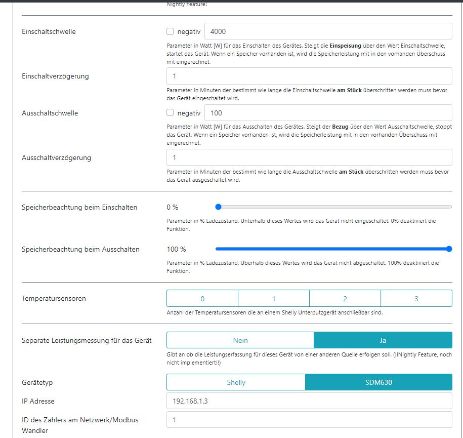 und Separate Leistungsmessung auf Ja, SDM630 , Ip Adresse und Zähler ID von SDM630 angeben.